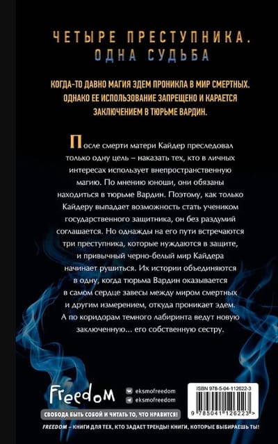 После смерти матери Кайдер преследовал только одну цель — наказать тех, кто в личных интересах использует внепространственную магию. По мнению юноши, они обязаны находиться в тюрьме Вардин. Поэтому, как только Кайдеру выпадает возможность стать учеником государственного защитника, он без раздумий соглашается. Но однажды на его пути встречаются три преступника, которые нуждаются в защите, и привычный черно-белый мир Кайдера начинает рушится. Их истории объединяются в одну, когда Вардин оказывается в самом сердце завесы между миром смертных и другим измерением, откуда проникает эдем. А по коридорам темного лабиринта ведут новую заключенную… его собственную сестру.