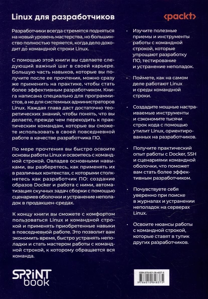 Книга написана специально для программистов, а не для системных администраторов Linux. Каждая глава даст достаточно теоретических знаний, чтобы понять, что вы делаете, прежде чем переходить к практическим командам, которые вы сможете использовать в своей повседневной работе в качестве разработчика ПО.