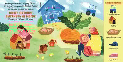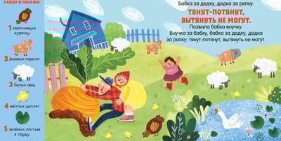 Знаменитый сюжет дополнен яркими современными картинками. Ищите на них заданные предметы, например пять красных редисок или двух розовых поросят, учите цвета, осваивайте первый счет, развивайте внимательность и память малыша. А в конце книги ждут интерактивные развивающие задания с героями сказки и даже тематический лабиринт.