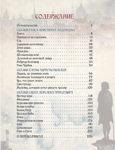 В антологию датских сказок вошли как редкие произведения Ганса-Христиана Андерсена, так и волшебные истории Елены Августы Нюблом и одиннадцать народных сказок в обработке Свена Херслеба Грундтвига, которые издаются впервые с 1878 года.