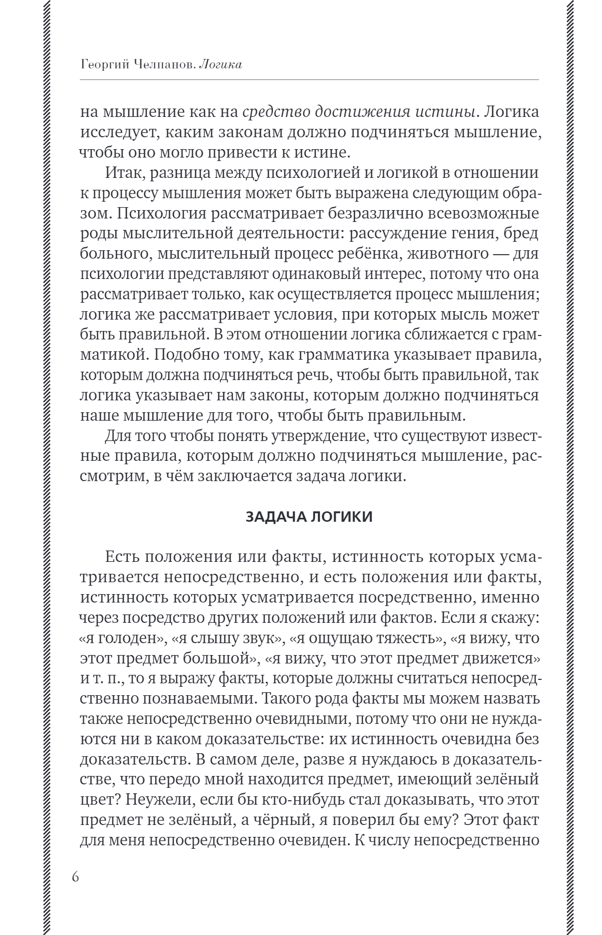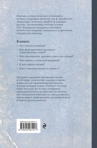 Именно логика помогает установить истину, сохранить ясность ума и стройность мышления, избегать ошибок и ловушек разума. Знаменитый учебник логики Георгия Челпанова выдержал огромное количество изданий, актуален и современен сегодня как никогда.