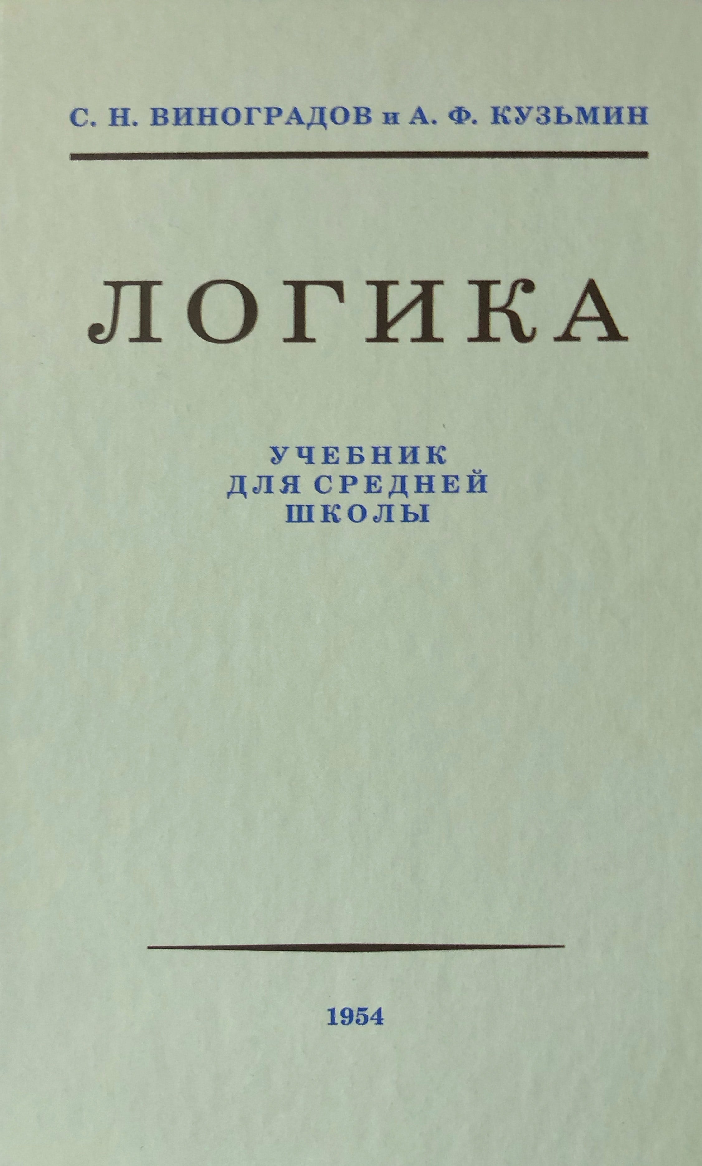 В 1954 году в СССР был выпущен учебник по логике авторства Сергея Николаевича Виноградова и Александра Ферапонтовича Кузьмина. Учебный материал предназначен для учащихся средней школы. Благодаря учебнику, школьники знакомятся с основами логики, логическими приемам Учебник по логике 1954 года выпуска разрабатывался уважаемыми учеными и строго контролировался государством. Пособие получилось качественным, наполненным информацией. Школьники получали энциклопедические знания по логике, которые могли применить на практике.