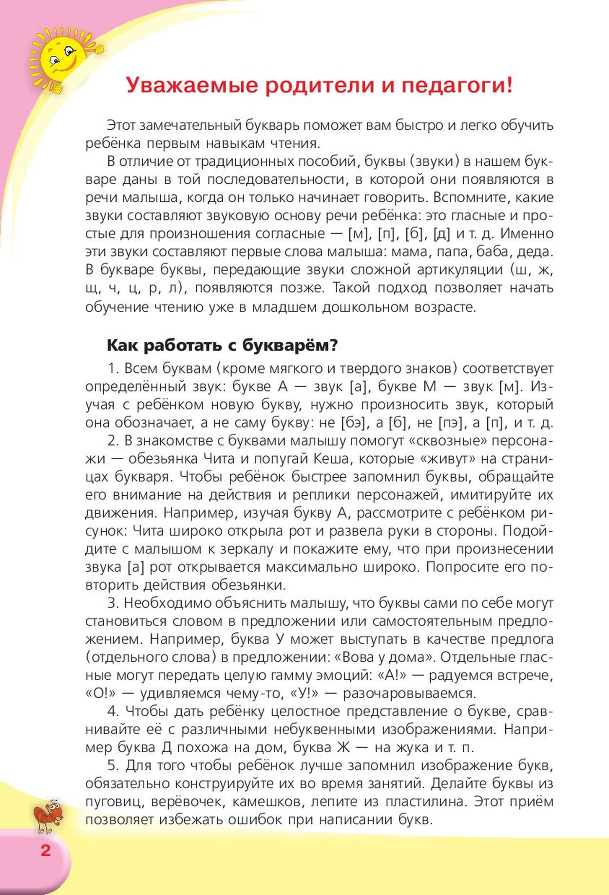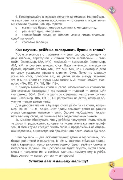 Данный букварь значительно упрощает этот процесс, благодаря весёлым персонажам, которые дают зрительные и двигательные подсказки малышу.