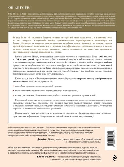 Книга доктора Мишо — настоящая библия ортопеда. Это всеобъемлющее издание начинает рассмотрение движения с полного обзора эволюции двуногости. Автор описывает функциональную анатомию каждого сустава нижней конечности, таза и позвоночника. Вся информация рассматривается в совокупности с правильными и неправильными паттернами движения в цикле походки. В результате мы получаем наиболее полное описание передвижения человека из когда-либо опубликованных.