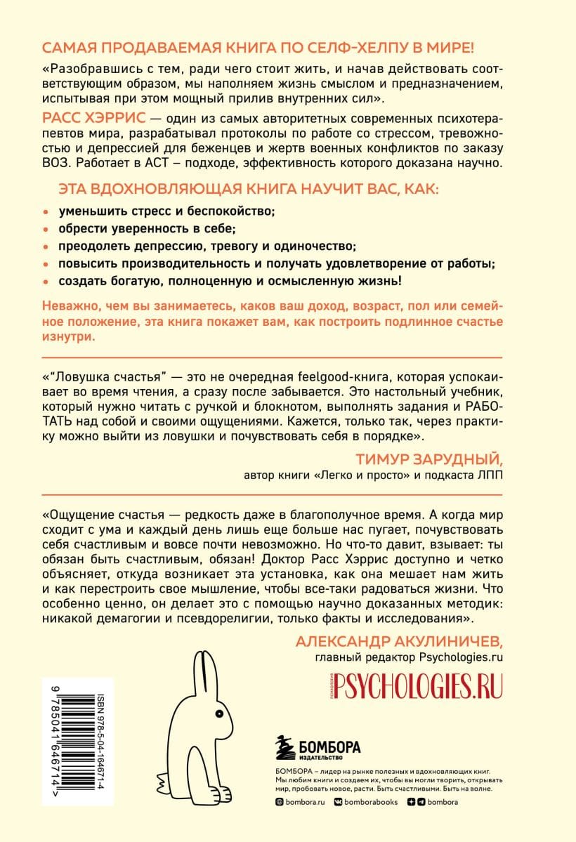 Переиздание легендарной книги Расса Хэрриса «Ловушка счастья»! Полностью переработанное издание. Более 50% новой информации, еще больше упражнений, новые тематические главы посвященные актуальным проблемам. Сколько раз в жизни вы пытались обрести счастье? Боролись, шли наперекор трудностям, страдали от неудач и поражений. Как часто вам казалось, что счастье скоротечно и на самом деле вы ожидали большего? Все мы с легкостью попадаем в искусную психологическую ловушку, основанную на общепризнанных представлениях о счастье, и самое удивительное, что мы даже этого не замечаем. Мы искренне верим, что быть счастливым – естественное состояние человека, и сильно расстраиваемся, когда не можем этого достичь. Всемирно известный специалист в области Терапии принятия и ответственности (АСТ) Расс Хэррис расскажет о мифах, царящих вокруг понятия «счастье», и объяснит, можно ли действительно стать счастливым.