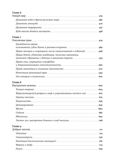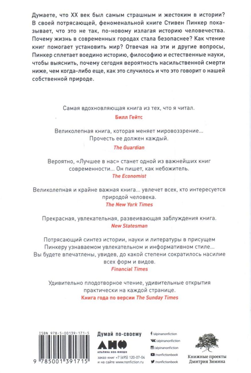 В этой революционной работе Пинкер исследует глубины человеческой природы и, сочетая историю с психологией, рисует удивительную картину мира, который все чаще отказывается от насилия. Автор помогает понять наши запутанные мотивы — внутренних демонов, которые склоняют нас к насилию, и добрых ангелов, указывающих противоположный путь, — а также проследить, как изменение условий жизни помогло нашим добрым ангелам взять верх.