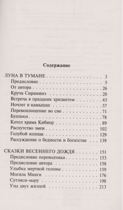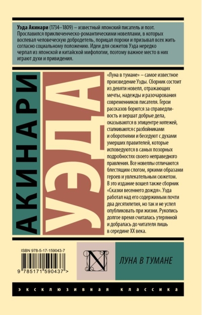 «Луна в тумане» — самое известное произведение Уэды. Сборник состоит из девяти новелл. отражающих мечты. надежды и разочарования современников писателя. Герои рассказов борются за справедливость и вершат добрые дела. оказываются в эпицентре мятежей. сталкиваются с разбойниками и оборотнями и беседуют с духами умерших правителей. которые исповедуются в самых позорных подробностях своего неправедного правления. Все новеллы отличаются блестящим слогом. яркими образами героев и увлекательным сюжетом.
