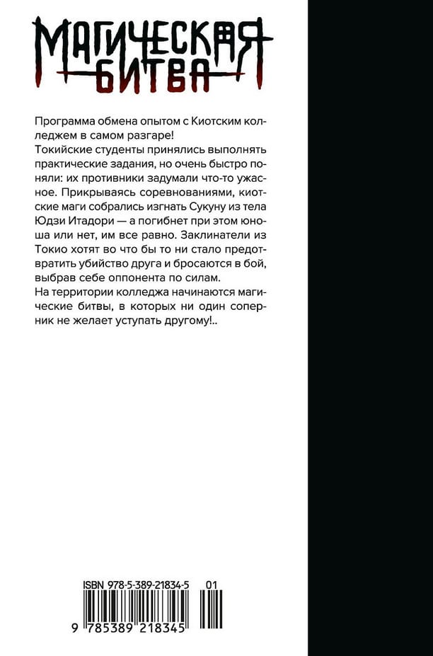 Программа обмена опыта с Киотским колледжем в самом разгаре! Токийские студенты принялись выполнять учебные задания, но очень быстро поняли: их противники задумали что-то ужасное. Прикрываясь соревнованиями, киотские маги собрались изгнать Сукуну из тела Юдзи Итадори – а погибнет при этом юноша или нет, им все равно. Заклинатели из Токио хотят во что бы то ни стало предотвратить убийство друга и бросаются в бой, выбрав себе оппонента по силам. На территории колледжа начинаются магические битвы, в которых ни один соперник не желает уступать другому!..