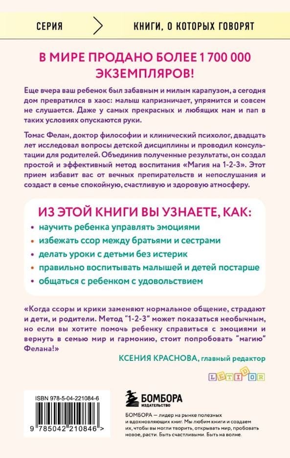 Еще вчера ваш ребенок был забавным и милым карапузом, а сегодня дом превратился в место военных действий: малыш капризничает, упрямится и совсем не слушается. Даже у самых прекрасных и любящих мам и пап в таких условиях опускаются руки. Томас Фелан, доктор философии и клинический психолог, двадцать лет исследовал вопросы детской дисциплины и проводил консультации для родителей. Объединив полученные результаты, он создал простой и эффективный метод воспитания «Магия на 1-2-3». Этот прием избавит вас от вечных препирательств и непослушания и создаст в семье спокойную, счастливую и здоровую атмосферу.