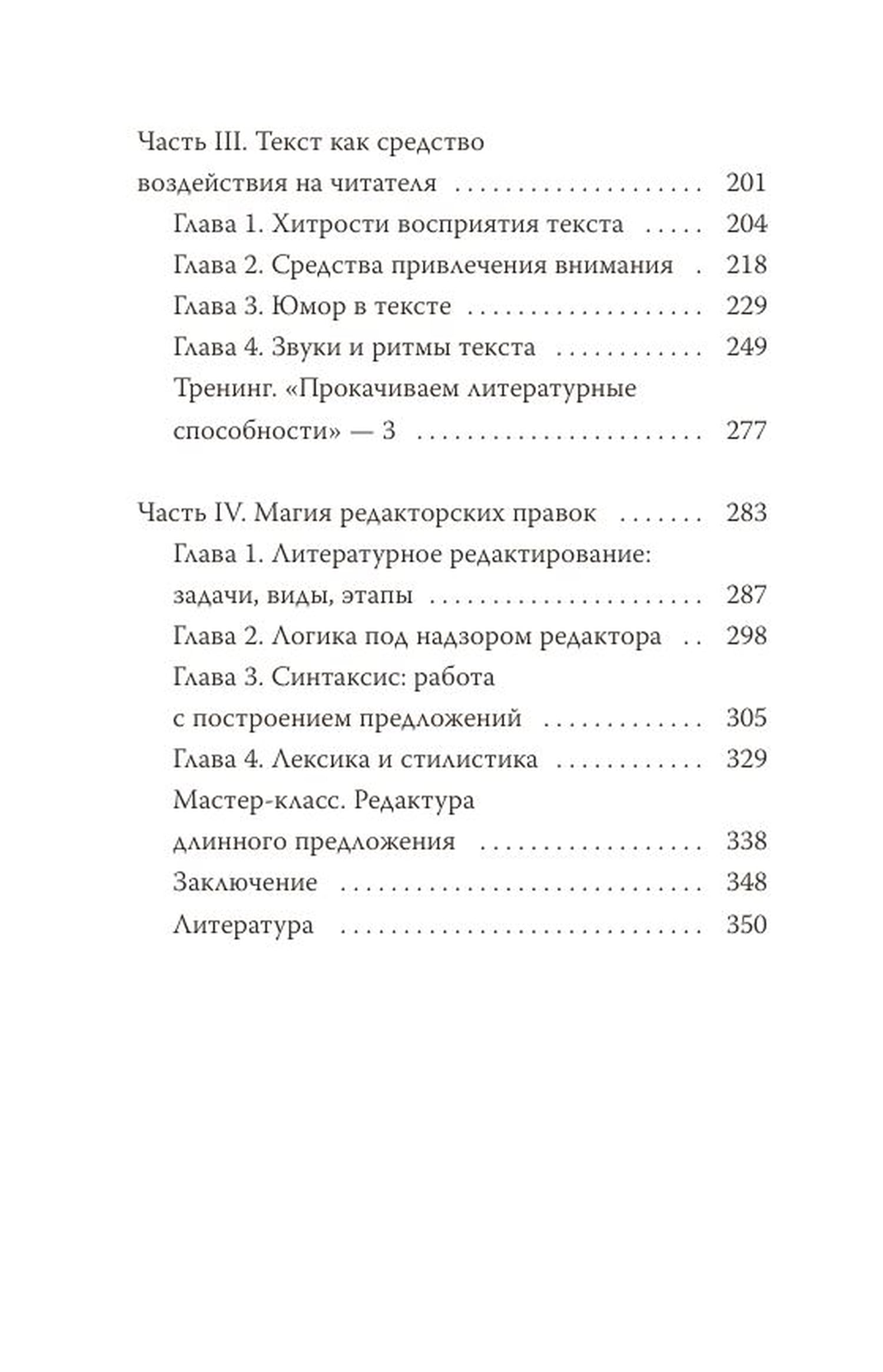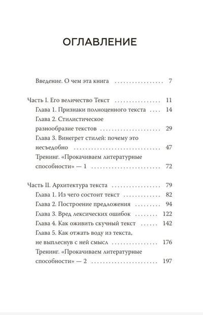 Эта книга состоит из 4 частей. Первая рассказывает о внешней форме текста и стилях, вторая — о содержательной части текста, третья учит, как при помощи слов и фраз воздействовать на читателя, а четвертая посвящена литературному редактированию и приемам улучшения текста.