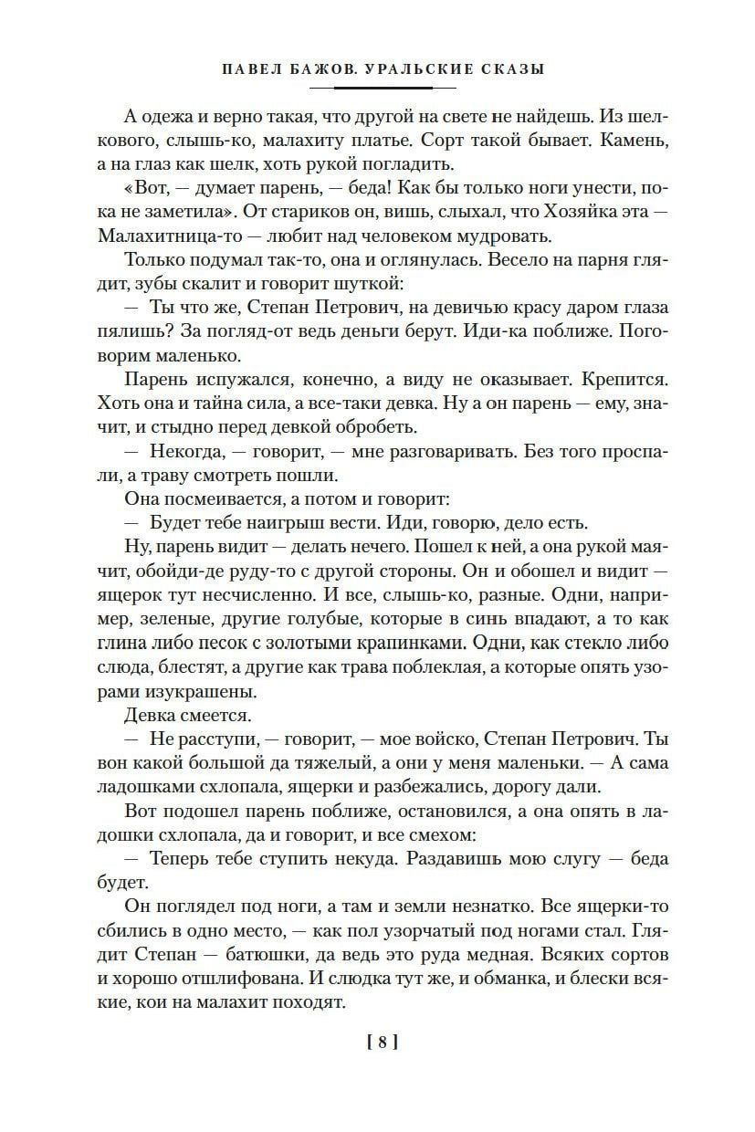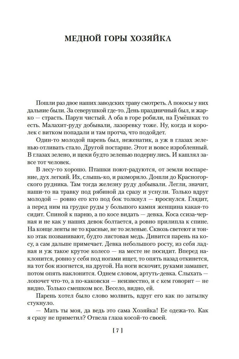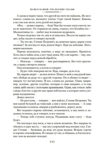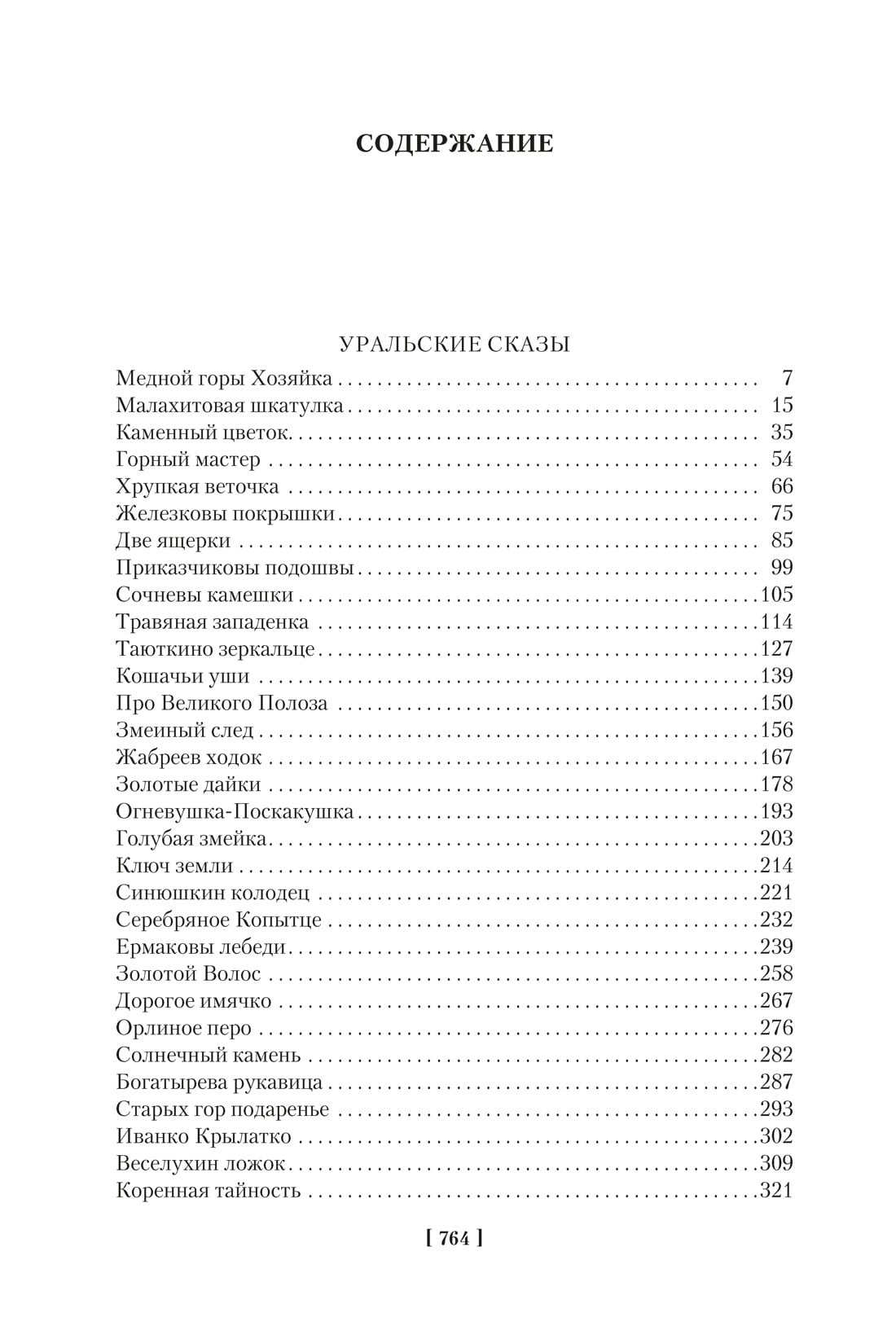 В издание вошло полное собрание уральских сказов П. Бажова: «Каменный цветок», «Малахитовая шкатулка», «Медной горы хозяйка», «Серебряное копытце» и другие, а также автобиографические повести «Зеленая кобылка», «Дальнее — близкое» и сборник «Уральских былей», в основу которых легли воспоминания об уральской жизни и детских годах писателя.