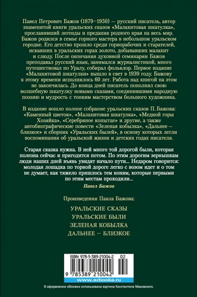 Павел Петрович Бажов (1879–1950) — русский писатель, автор знаменитой книги уральских сказов «Малахитовая шкатулка», прославивший легенды и предания родного края на весь мир. Бажов родился в семье горного мастера в небольшом уральском городке. Его детство прошло среди горнорабочих и старателей, искавших в уральских горах золото, добывавших малахит и слюду. После окончания духовной семинарии Бажов преподавал русский язык, занимался журналистикой, много путешествовал по Уралу, собирал фольклор. Первое издание «Малахитовой шкатулки» состоялось в 1939 году. Бажову к этому времени исполнилось 60 лет. Работа над книгой на этом не закончилась. До конца дней писатель пополнял свою волшебную шкатулку новыми сказами, соединившими народную поэзию и мудрость с тонким мастерством большого художника.