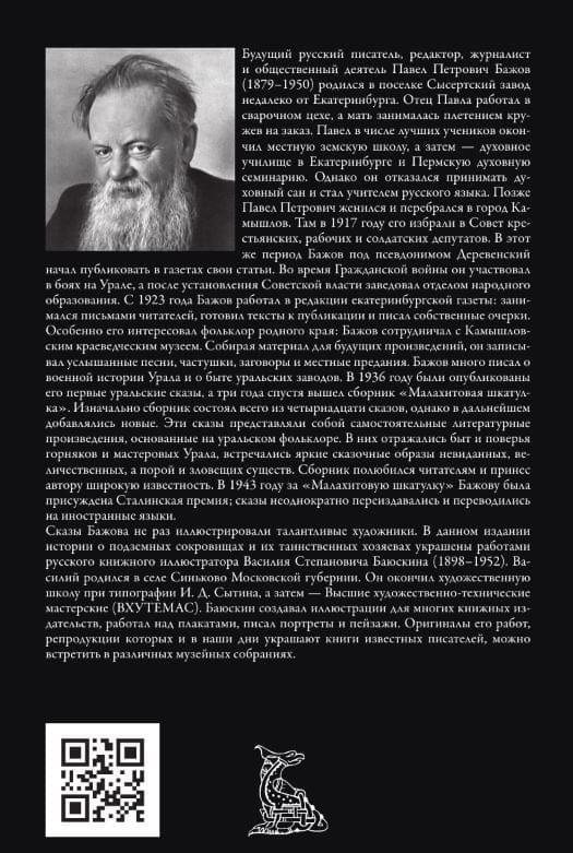 Будущий русский писатель, редактор, журналист и общественный деятель Павел Петрович Бажов (1879–1950) родился в поселке Сысертский завод недалеко от Екатеринбурга. Собирая материал для будущих произведений, он записывал услышанные песни, частушки, заговоры и местные предания. Бажов много писал о военной истории Урала и о быте уральских заводов. В 1936 году были опубликованы его первые уральские сказы, а три года спустя вышел сборник «Малахитовая шкатулка». Изначально сборник состоял всего из четырнадцати сказов, однако в дальнейшем добавлялись новые. Эти сказы представляли собой самостоятельные литературные произведения, основанные на уральском фольклоре. В них отражались быт и поверья горняков и мастеровых Урала, встречались яркие сказочные образы невиданных, величественных, а порой и зловещих существ. Сборник полюбился читателям и принес автору широкую известность.