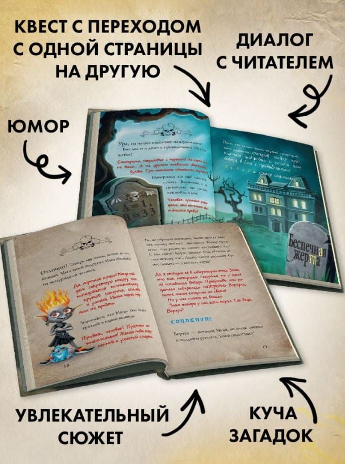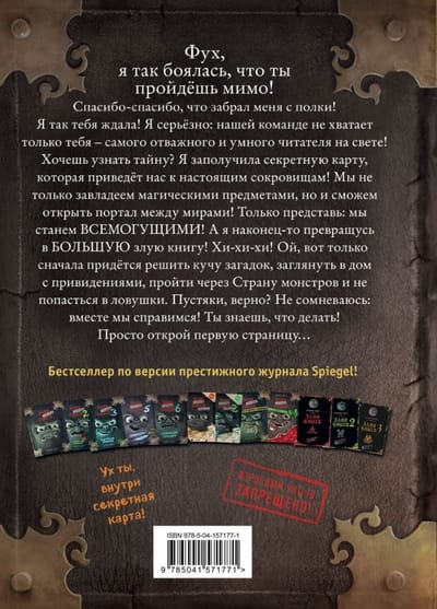 Внимание! Срочные новости! Маленькая злая книга заполучила секретную карту, которая может привести её к магическим сокровищам и… таинственному порталу! Если ей удастся открыть его, то она проберётся в мир людей! Но вот незадача: без читателя ей не справиться! А это значит, что злюка снова нуждается в твоей помощи! Тебе придётся решить новые загадки, побывать в доме с привидениями, заглянуть в Страну монстров и побывать в самом опасном месте на свете! Рискнёшь ли ты принять этот вызов? Избавляет от страха перед чтением! Бестселлер по версии престижного журнала Spiegel.
