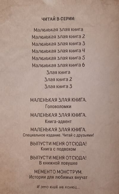 «Маленькая злая книга» снова удивляет! Фишка этого издания — запечатанные страницы, которые нужно открывать строго по 2 день (и так 24 раза!). Но что осталось неизменным — так это весёлые приключения, неожиданные повороты сюжета, разнообразные задания и встречи с удивительными героями.