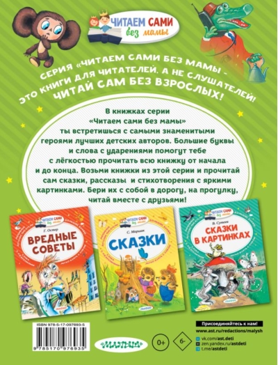Книга «Маленькие сказочки про Чебурашку и крокодила Гену» Э. Успенского отлично подходит для первого самостоятельного чтения. Ведь в этом сборнике удобного формата коротенькие сказочки, большие буквы, слова с ударениями и много цветных иллюстраций. Книжки серии «Читаем сами без мамы» можно легко брать с собой в дорогу, на прогулку и читать вместе с друзьями. Для дошкольного возраста.