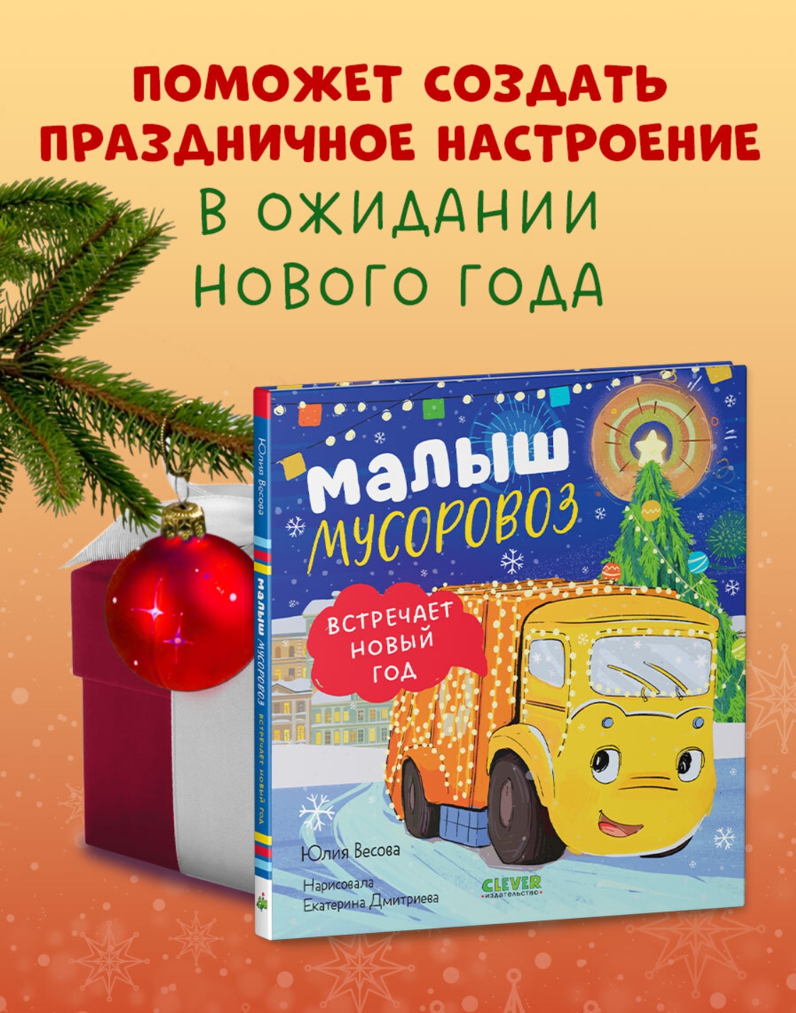 Маленькому читателю понравятся простые и понятные стихи с безупречными рифмами, очень яркие и новогодние иллюстрации. А еще можно научиться «говорить», как машины, развивая речь, — вжж-вжж, бип-бип, р-рам, р-рам! И конечно, с новогодним настроением можно вместе с малышом мусоровозом готовиться к празднику!
