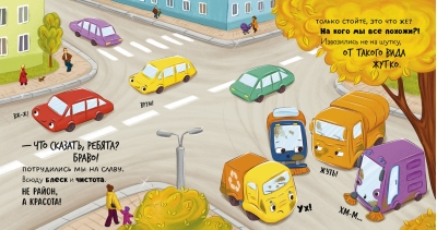 Мусоровоз весь день трудился и сильно испачкался. Друзья зовут его на мойку, но малыш переживает — вдруг, когда ему будут тереть бока, в фары полезет пена или станет щекотно. Он едет на стоянку, но вот незадача — грязнулю не пускают в гараж. Неужели все-таки придется помыться?