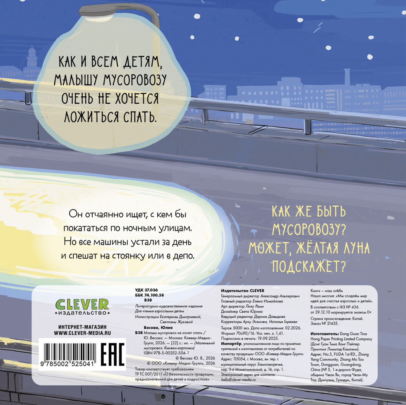 «Малыш мусоровоз не хочет спать» — уютная история в стихах, которая поможет ребенку настроиться на сон. Мягкие дружелюбные иллюстрации и убаюкивающие стихи Юлии Весовой превратят засыпание в приятный ритуал!