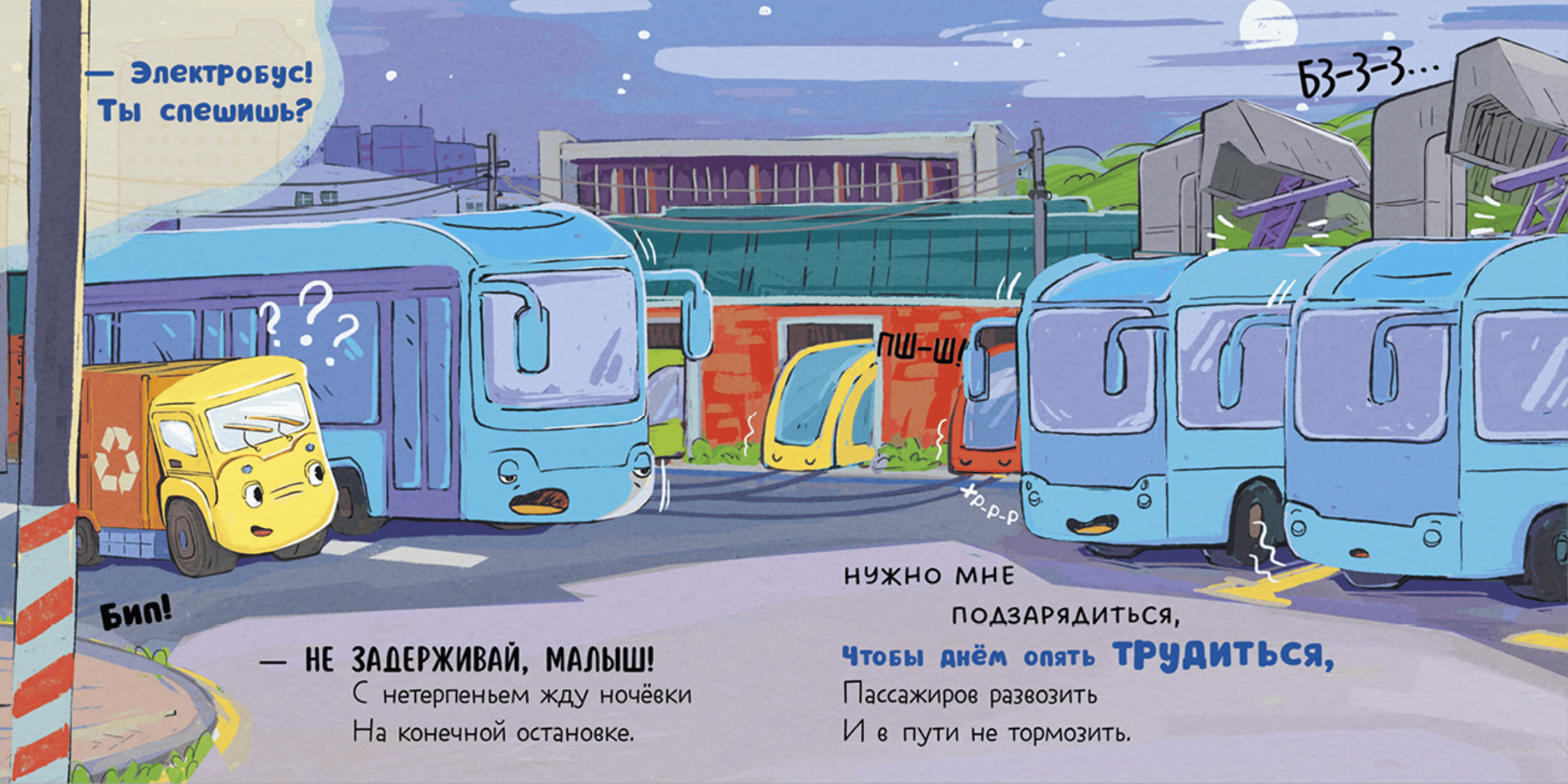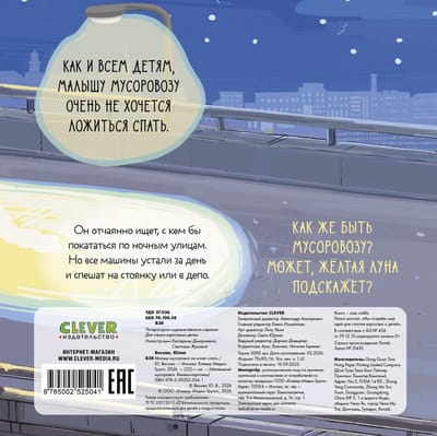 Как и всем детям, малышу мусоровозу очень не хочется ложиться спать. Он отчаянно ищет, с кем бы покататься по ночным улицам. Но все машины устали за день и спешат на стоянку или в депо. Как же быть мусоровозу? Может, желтая луна подскажет?
