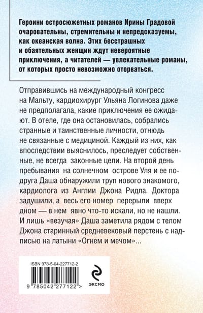 Отправившись на международный конгресс на Мальту, кардиохирург Ульяна Логинова даже не предполагала, какие приключения ее ожидают. В отеле, где она остановилась, собрались странные и таинственные личности, отнюдь не связанные с медициной. Каждый из них, как впоследствии выяснилось, преследует собственные, не всегда законные цели. На второй день пребывания на солнечном острове Уля и ее подруга Даша обнаружили труп нового знакомого, кардиолога из Англии Джона Ридла. Доктора задушили, а весь его номер перерыли верх дном — в нем явно что-то искали, но не нашли. И лишь «везучая» Даша заметила рядом с телом Джона старинный средневековый перстень с надписью на латыни «Огнем и мечом»...