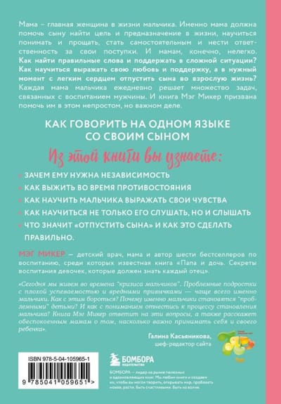 Мама – главная женщина в жизни мальчика. Именно мама должна помочь сыну найти цель и предназначение в жизни, научиться понимать и прощать, стать самостоятельным и нести ответственность за свои поступки. И мамам, конечно, нелегко. Как найти правильные слова и поддержать в сложной ситуации? Как стать хорошим примером? Как научиться выражать свою любовь и поддержку, а в нужный момент с легким сердцем отпустить сына во взрослую жизнь? Каждая мама мальчика ежедневно решает множество задач, связанных с воспитанием мужчины. И книга Мэг Микер призвана помочь им в этом непростом, но важном деле.
