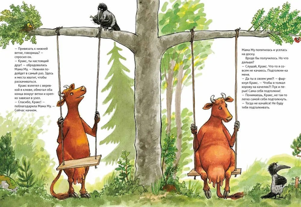 На дворе был отличный летний денек. Светило солнышко, пели птички, жужжали мухи. Коровы паслись на лугу. Все, кроме одной. Что затеяла Мама Му на этот раз? Зачем ей доска и веревки? И почему Кракс опять недоволен? Как бы то ни было, друзьям всегда весело вдвоем, приключения не кончаются!