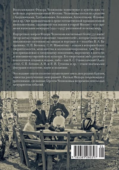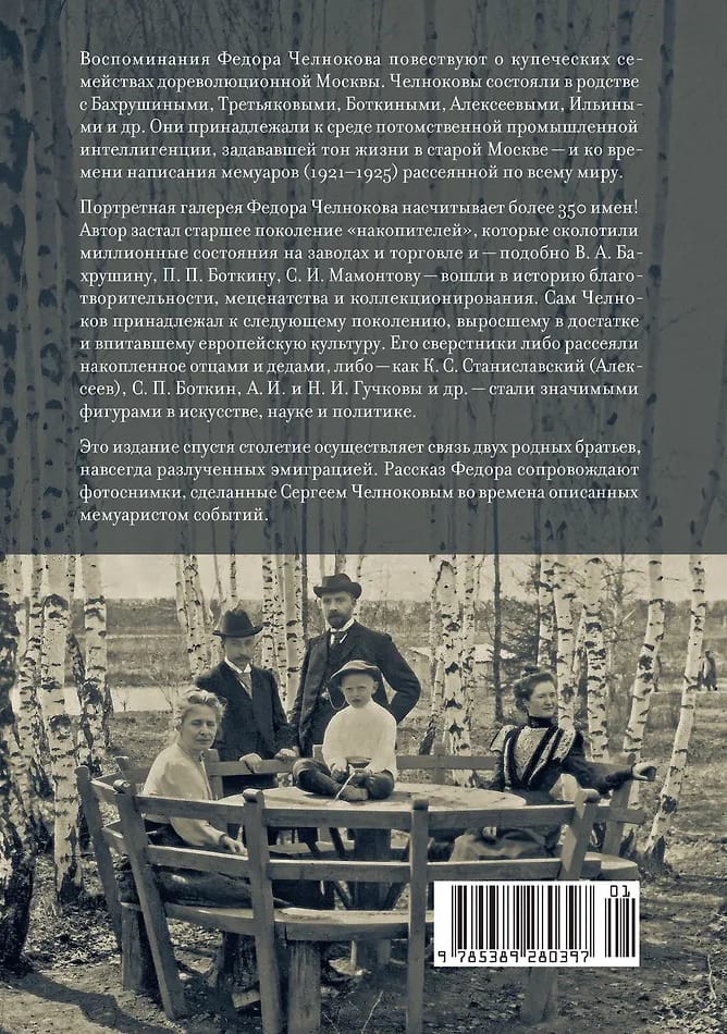 Воспоминания Федора Васильевича Челнокова (1866–1925) издаются впервые. Рукопись, написанная в Берлине в 1921–1925 гг., рассказывает о купеческих семействах старой Москвы, знакомых автору с рождения. Челноковы, Бахрушины, Третьяковы, Боткины, Алексеевы, Ильины — в поле внимания автора попадают более 350 имен из числа его родственников и друзей. Издание сопровождают фотографии, сделанные братом мемуариста, Сергеем Васильевичем Челноковым (1860–1924).