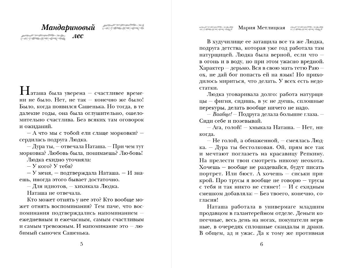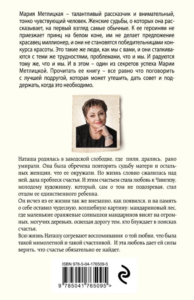 Наташа родилась в заводской слободке, где пили, дрались, рано умирали. Она была обречена повторить судьбу матери и остальных женщин, что ее окружали. Но жизнь словно сжалилась над ней, дала проблеск счастья. И этим счастьем стала любовь к Чингизу, молодому художнику, который, сам о том не подозревая, стал отцом ее единственного ребенка. Он исчез из ее жизни так же внезапно, как появился, и на память о себе оставил чудесную, волшебную картину: мандариновый лес, где маленькие оранжевые солнышки мандаринов висят на огромных, могучих деревьях, освещая дорогу тем, кто блуждает в поисках счастья. Всю жизнь Наташу согревают воспоминания о той любви, что была такой мимолетной и такой счастливой. И эта любовь дает ей силы верить, что счастье обязательно ее найдет.