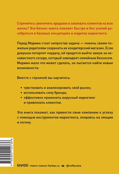 Стремитесь увеличить продажи и завоевать клиентов на всю жизнь? Эта бизнес-манга поможет быстро и без усилий разобраться в базовых концепциях и моделях маркетинга. Перед Маримо стоит непростая задача – помочь своим пожилым родителям сохранить их кондитерский магазин. Если девушка потерпит неудачу, ей придется выйти замуж за ненавистного соседа, который завладеет семейным бизнесом.