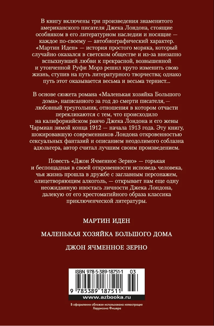 В книгу включены три произведения знаменитого американского писателя Джека Лондона, стоящие особняком в его литературном наследии и расширяющие его хрестоматийный образ классика приключенческой литературы. «Мартин Иден»– история простого моряка, который случайно оказался в светском обществе и из-за внезапно вспыхнувшей любви к прекрасной, возвышенной и утонченной Руфи Морз решил круто изменить свою жизнь, ступив на путь литературного творчества; однако путь этот оказывается весьма и весьма тернист… В основе сюжета романа «Маленькая хозяйка большого дома», написанного за год до смерти писателя, – любовный треугольник, отношения в котором отчасти перекликаются с тем, что происходило на калифорнийском ранчо Джека Лондона и его жены Чармиан зимой конца 1912 – начала 1913 года. Эту книгу, шокировавшую современников Лондона откровенностью сексуальных фантазий и описанием неодолимого соблазна адюльтера, автор считал лучшим своим произведением. Повесть «Джон Ячменное Зерно» – во многом автобиографическая, горькая и беспощадная в своей откровенности исповедь человека, чья жизнь прошла в дружбе с заглавным персонажем, олицетворяющим алкоголь, – открывает нам еще одну неожиданную ипостась личности Джека Лондона.