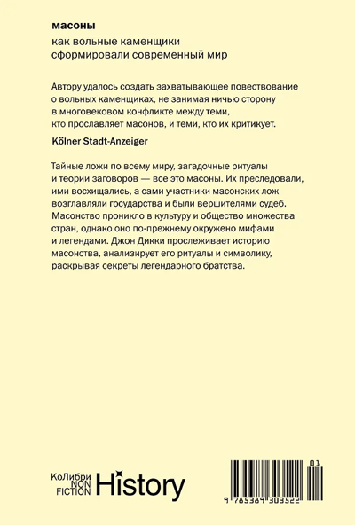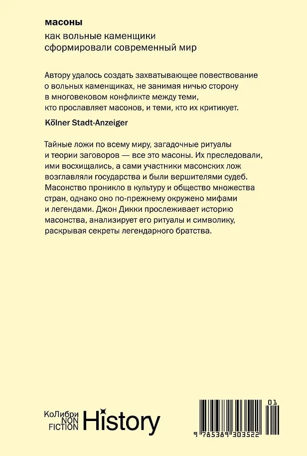 Возникшее в XVIII веке, братство на протяжении истории объединяло политиков, военных, спортсменов, актеров и писателей с нескольких континентов. Сегодня в Великобритании насчитывается 400 000 масонов, в США их более миллиона, а по всему миру — около шести миллионов. Масонов считали оппозиционерами, диверсантами и шпионами, по сей день вокруг движения существует множество теорий заговоров. Как проходили загадочные собрания лож? Что означает символика масонов? Какое положение в учении масонов занимают женщины? В ХХI веке масонство насчитывает несколько миллионов человек по всему миру и не теряет своего влияния. Британский историк Джон Дикки приоткрывает завесу тайны, которая окутывает масонское братство.