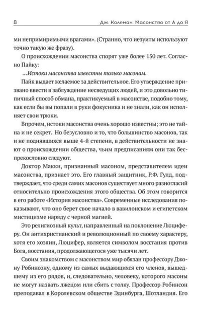 Они незримы, но они повсюду. О них слышали многие, но свидетельствуют единицы. Их кредо – тотальная секретность во имя своей безопасности. Их задача – изменение существующего миропорядка и провозглашение сатанизма единственной религией. Их методы – террор, убийства, войны и революции. Они – масоны, самая законспирированная деструктивная организация в мире. Более 300 лет Орден вольных каменщиков пишет кровью историю, прикрываясь именем Христа и псевдоблагочестивыми намерениями. Почему в голливудских фильмах так часто фигурируют сцены похорон? Можно ли превратить серебро в золото? Что символизирует форма здания Пентагона и чем на самом деле занимается Интерпол? Книга «Масонство от А до Я» – смелая попытка бывшего сотрудника британских спецслужб Джона Колемана разоблачить истинные цели, задачи и идеологию масонства. Ведь любое тайное общество, лишившись части своих секретов, навсегда теряет неконтролируемую силу и безграничную власть. А значит, мир становится хоть немного, но безопаснее и свободнее.
