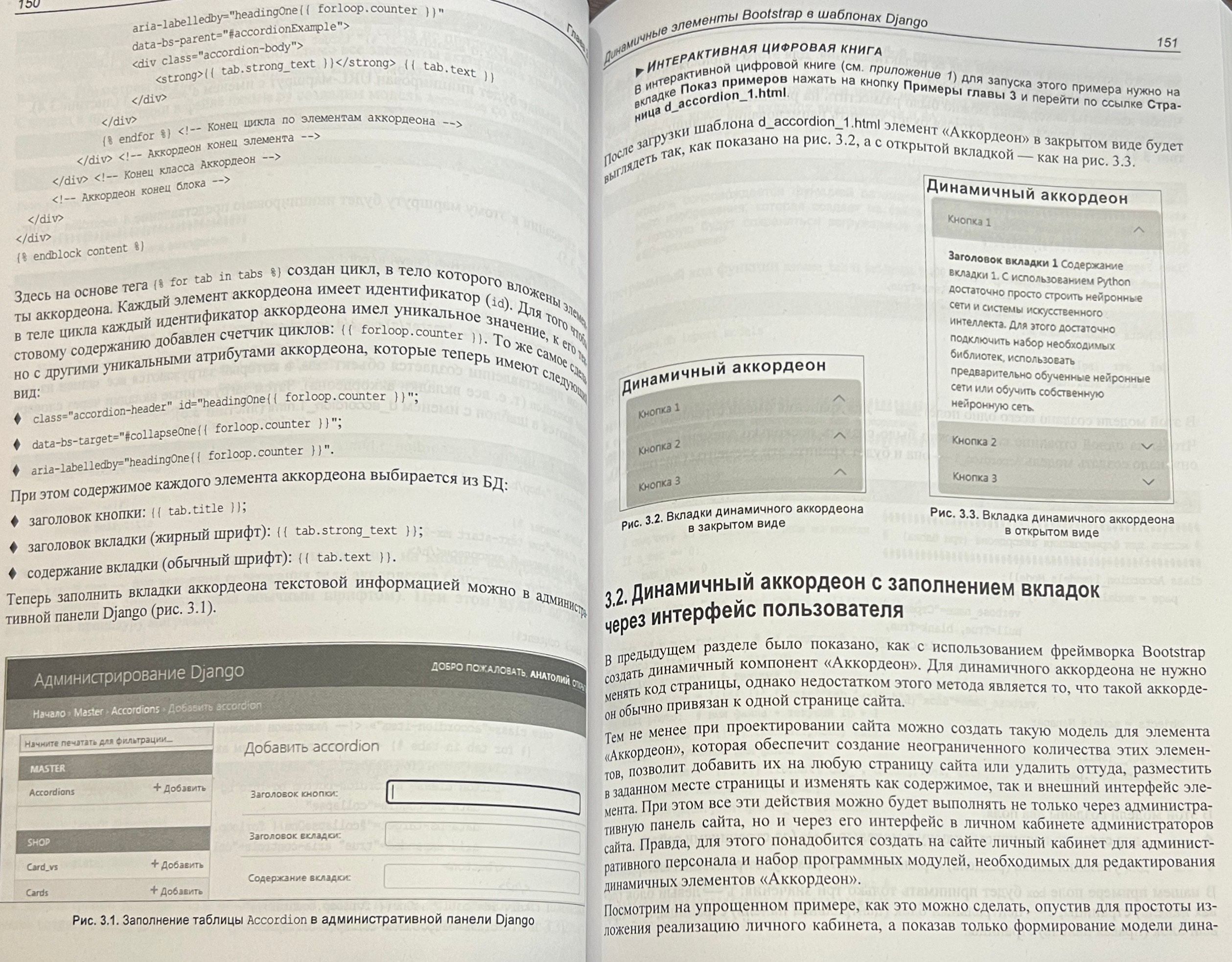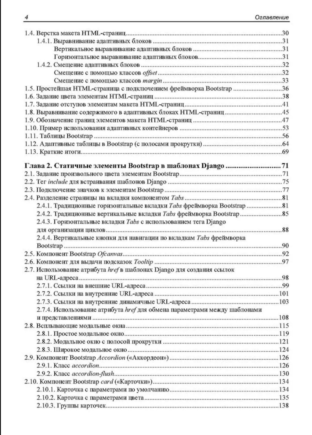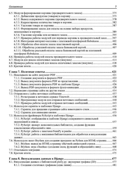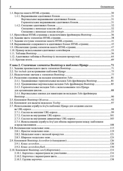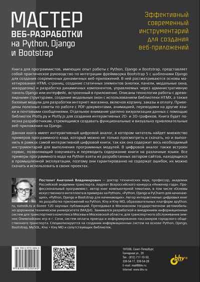 Книга представляет собой практическое руководство по интеграции фреймворка Bootstrap 5 с шаблонами Django для разработки на языке Python современных и динамичных веб-приложений. Рассматриваются основы макетирования HTML-страниц, создание статичных элементов (кнопки, панели, модальные окна, аккордеоны) и разработка динамичных компонентов, управляемых через административную панель Django или интерфейс личного кабинета администратора. Описаны технологии работы с древовидными структурами, создание модальных окон с использованием библиотеки HTMX, а также базовые модули для разработки интернет-магазина, включая корзину, заказы и оплату. Приведены полезные советы по работе с файлами PDF, анимацией, переводами на другие языки и почтовыми сообщениями. Отдельное внимание уделено визуализации данных с помощью библиотек Plotly.py и Plotly.js для создания интерактивных 2D- и 3D-графиков.