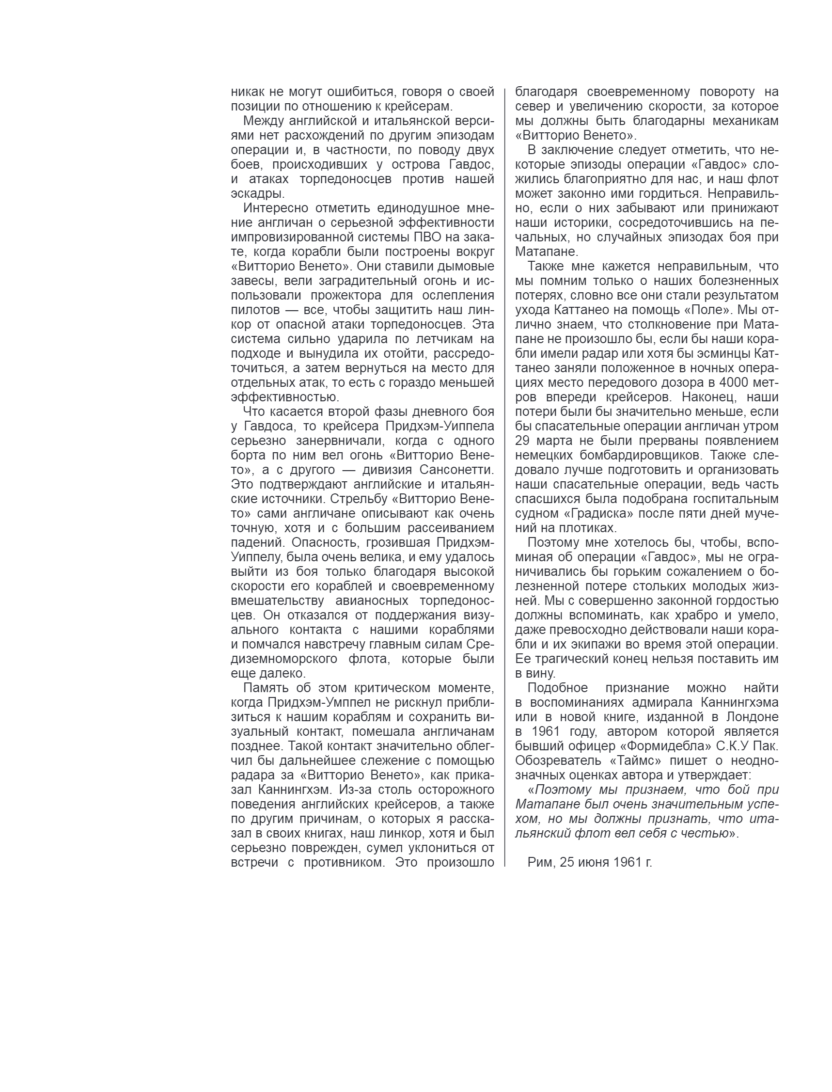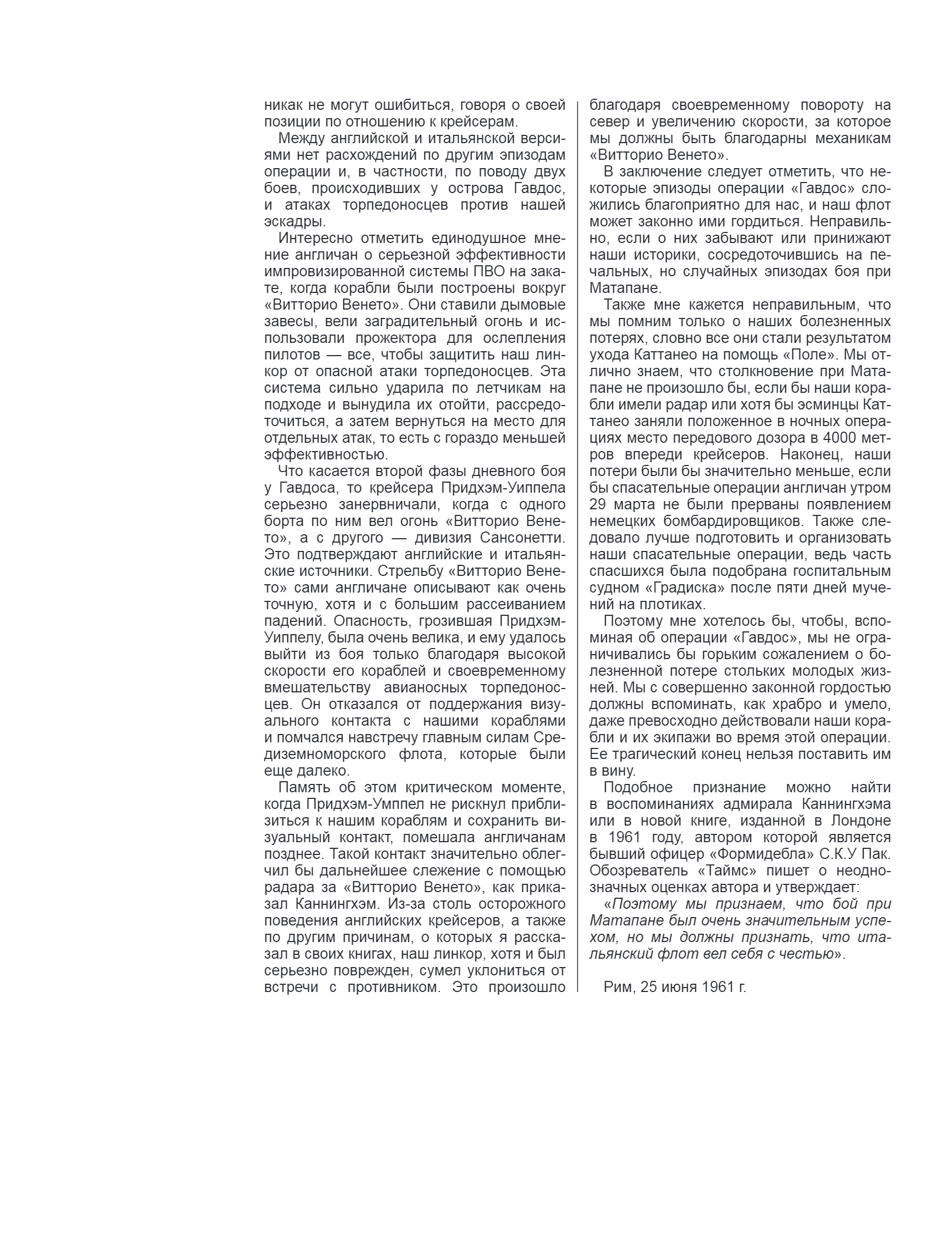 Сражение у мыса Матапан 27—29 марта 1941 года стало самым крупным и результативным морским противостоянием на Средиземном море в ходе Второй мировой. Впервые в истории исход битвы на море решила палубная авиация. Именно после Матапана авианосцы превратились в самых грозных противников линкоров. Эскадра адмирала Каннингема у крайней южной точки Греции нанесла итальянцам настолько сокрушительное поражение, что они так и не смогли оправиться от него вплоть до капитуляции Королевских военно-морских сил Италии (Regia Marina). Потери флота Муссолини составили три тяжелых крейсера, два эсминца, более двух тысяч моряков погибшими, а также серьезные повреждения получил линкор «Витторио Венето». При этом британцы, которые будут господствовать в Восточном Средиземноморье до захвата немецкой армией Крита, потеряли всего один самолет-торпедоносец вместе с экипажем из трех человек. Поражение у мыса Матапан привело к тому, что итальянские ВМС фактически больше не принимали кого-либо активного участия в боевых действиях, даже несмотря на свое техническое и численное превосходство. Крупные силы флота Муссолини теперь выйдут в море только в сентябре 1943 года и лишь для того, чтобы сдаться союзникам на Мальте.