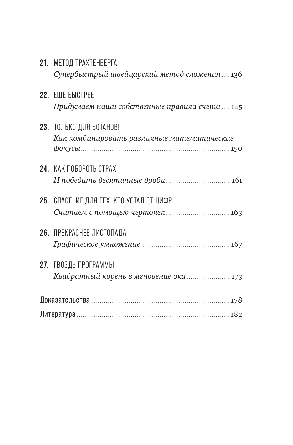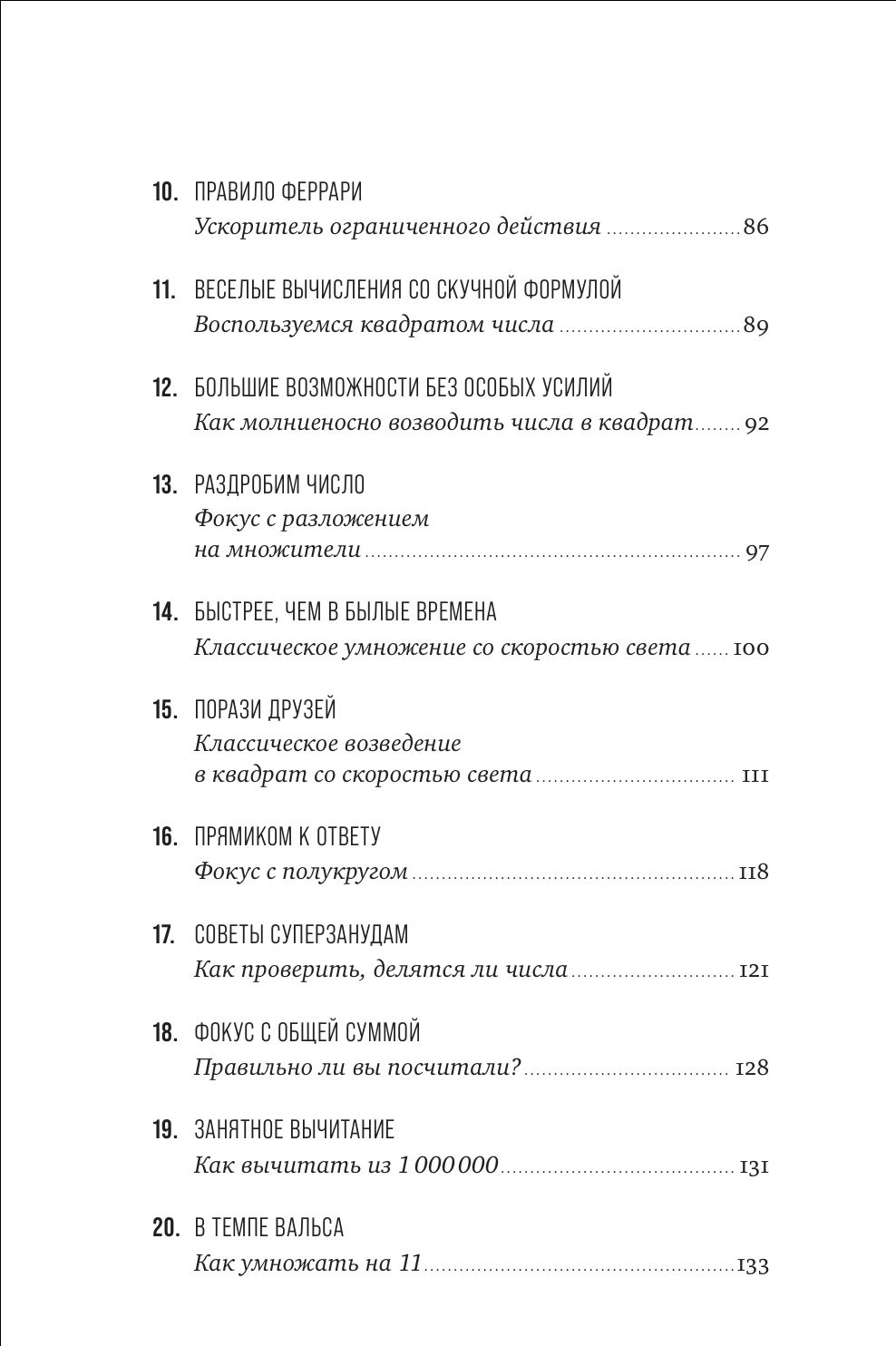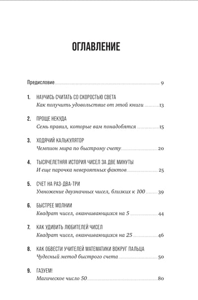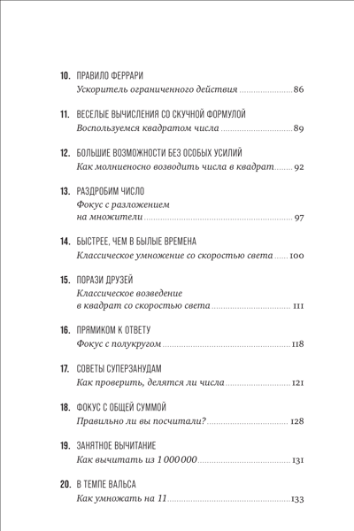 Вы узнаете о простых и нескучных методах быстрого счета, для которых понадобится лишь знание базовых арифметических правил. Метод Трахтенберга, китайский способ счета с помощью черточек и множество других математических техник помогут вам без труда складывать и вычитать, умножать и делить, извлекать квадратный корень и возводить в квадрат большие числа.