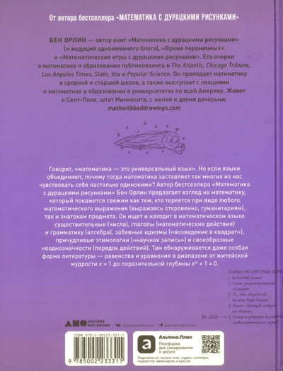 Говорят, математика — это универсальный язык. Автор бестселлера «Математика с дурацкими рисунками» Бен Орлин подумал: а что, если воспринять эту идею буквально? Не «математика — это что-то вроде логической поэзии» или «математика — это, метафорически выражаясь, язык вселенной». Нет. Что, если математика — это язык в том же смысле, в каком языками являются испанский, арабский или дотракийский: средство, с помощью которого маленькая группа людей выражает свои маленькие человеческие мысли? Но если языки объединяют, почему тогда математика заставляет так многих из нас чувствовать себя настолько одинокими?
