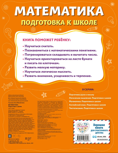 Эта книга для детей от 5 лет поможет дошкольнику научиться считать до 20 и познакомиться с математическими понятиями, которые необходимо знать будущему первокласснику. В рабочей тетради более 365 упражнений по математике, рассчитанных на каждый день года. Это способствует равномерному распределению учебной нагрузки и формированию положительного отношения ребёнка к обучению в школе. Дошкольник потренируется писать цифры, выполнять арифметические действия сравнения, сложения и вычитания и решать задачи. Он научится ориентироваться на листе бумаги, логически мыслить, станет внимательным, аккуратным, самостоятельным и приобретёт другие важные навыки, необходимые при обучении в школе.