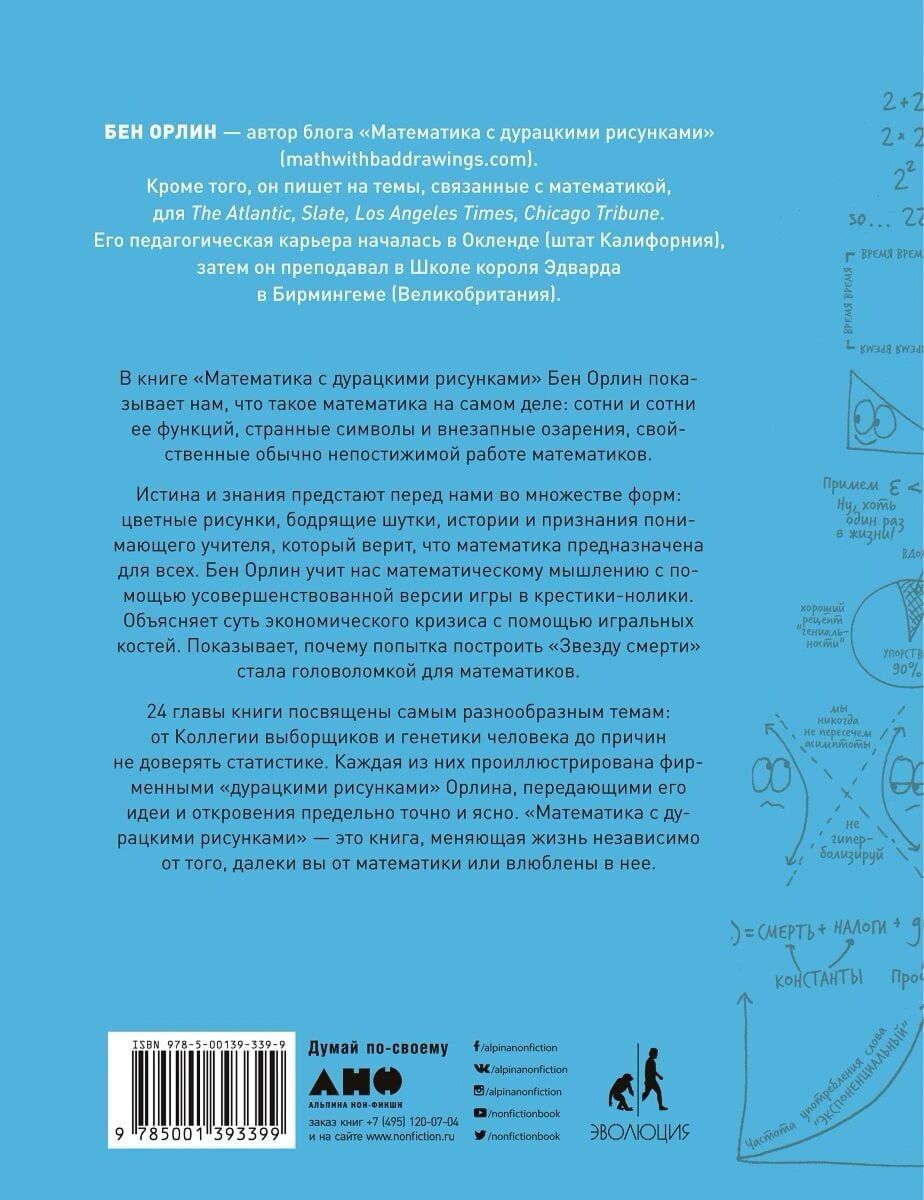 Орлин выступает не только как педагог, но и как художник-иллюстратор: его смешные человечки и закорючки покорили тысячи школьников, покорят и вас. Изящные каламбуры и забавные ассоциации, игры разума и цифровые загадки (к каждой из которых вы получите элегантную и ироничную разгадку) и, конечно, знаменитые фирменные рисунки (которые, вопреки заглавию, не такие уж дурацкие) позволяют Орлину легко и остроумно доносить самые сложные и глубокие математические идеи и убеждают в том, что даже математика может быть страшно интересной.