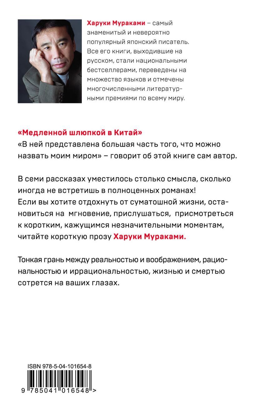 "Медленной шлюпкой в Китай" — первая книга короткой прозы японского классика современной мировой литературы Харуки Мураками. "В ней представлена большая часть того, что можно назвать моим миром", — говорил об этой книге сам автор. Безумный стилистический фейерверк, пронзительная нежность, трагизм и юмор мировосприятия, романтический сюрреализм будущего автора "Хроник Заводной Птицы" и "Послемрака"