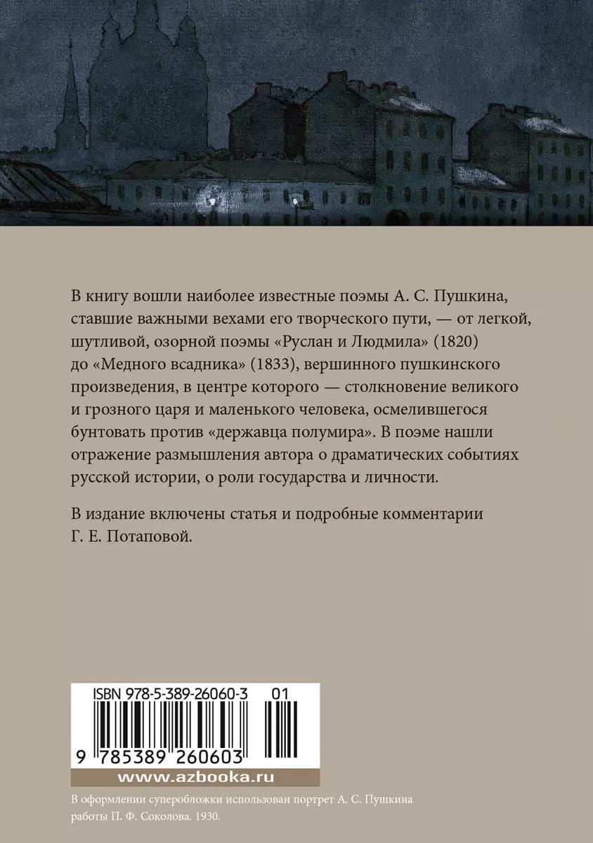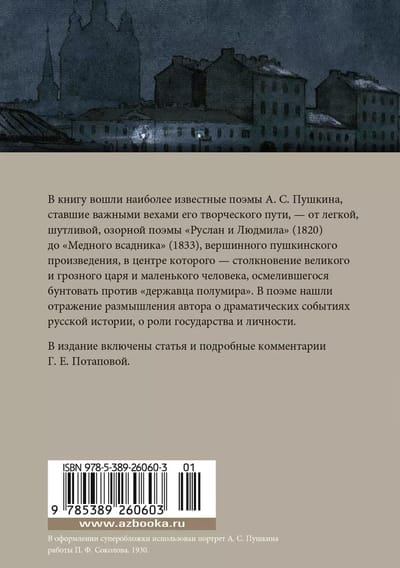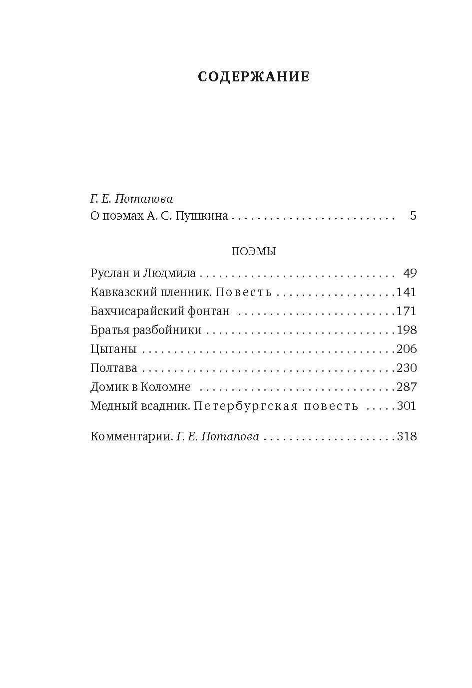 В книгу вошли наиболее известные поэмы А. С. Пушкина, ставшие важными вехами его творческого пути, — от легкой, шутливой, озорной поэмы «Руслан и Людмила» (1820) до «Медного всадника» (1833), вершинного пушкинского произведения, в центре которого — столкновение великого и грозного царя и маленького человека, осмелившегося бунтовать против «державца полумира». В поэме нашли отражение размышления автора о драматических событиях русской истории, о роли государства и личности. В издание включены статья и подробные комментарии Г. Е. Потаповой.