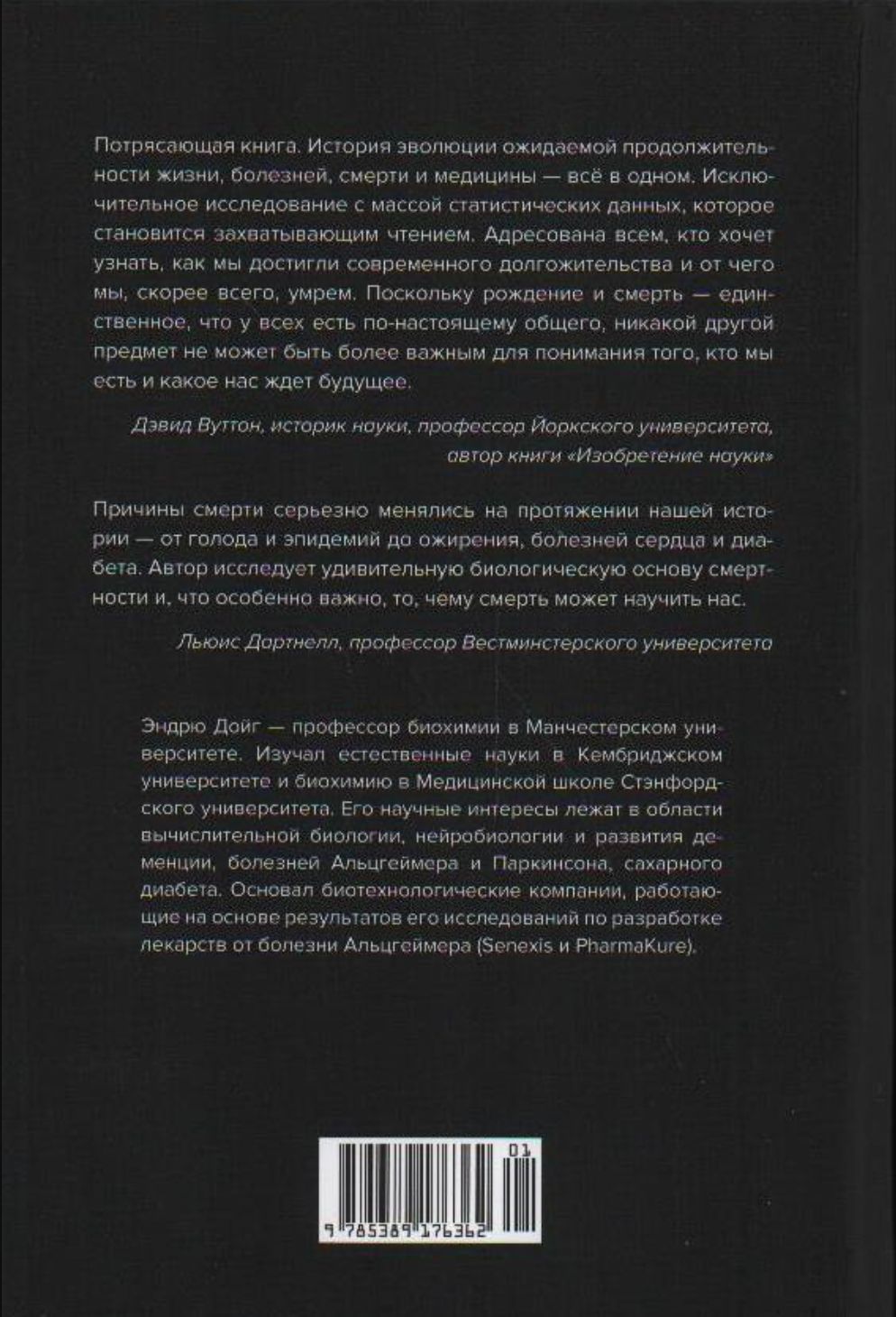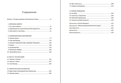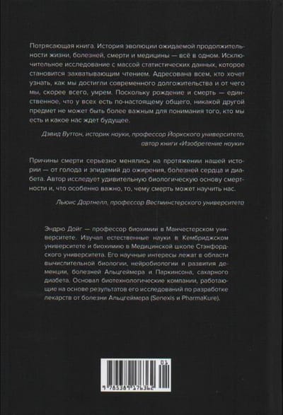 От средневекового голода и ныне полузабытой цинги до современного ожирения; от открытия витамина С и базовых правил санитарии и гигиены до терапии стволовыми клетками, редактирования ДНК, генной инженерии — освещая темы причин человеческой смерти в срезе множества поколений и вопросы охраны здоровья, профессор Манчестерского университета Эндрю Дойг насыщает свой рассказ интереснейшими фактами из области истории, культуры, политики, права и экономики. Особо выделяется тема вредных привычек и всевозможных зависимостей. Захватывающая история накопления знаний в области медицины, удивительных достижений и надежд на будущее.