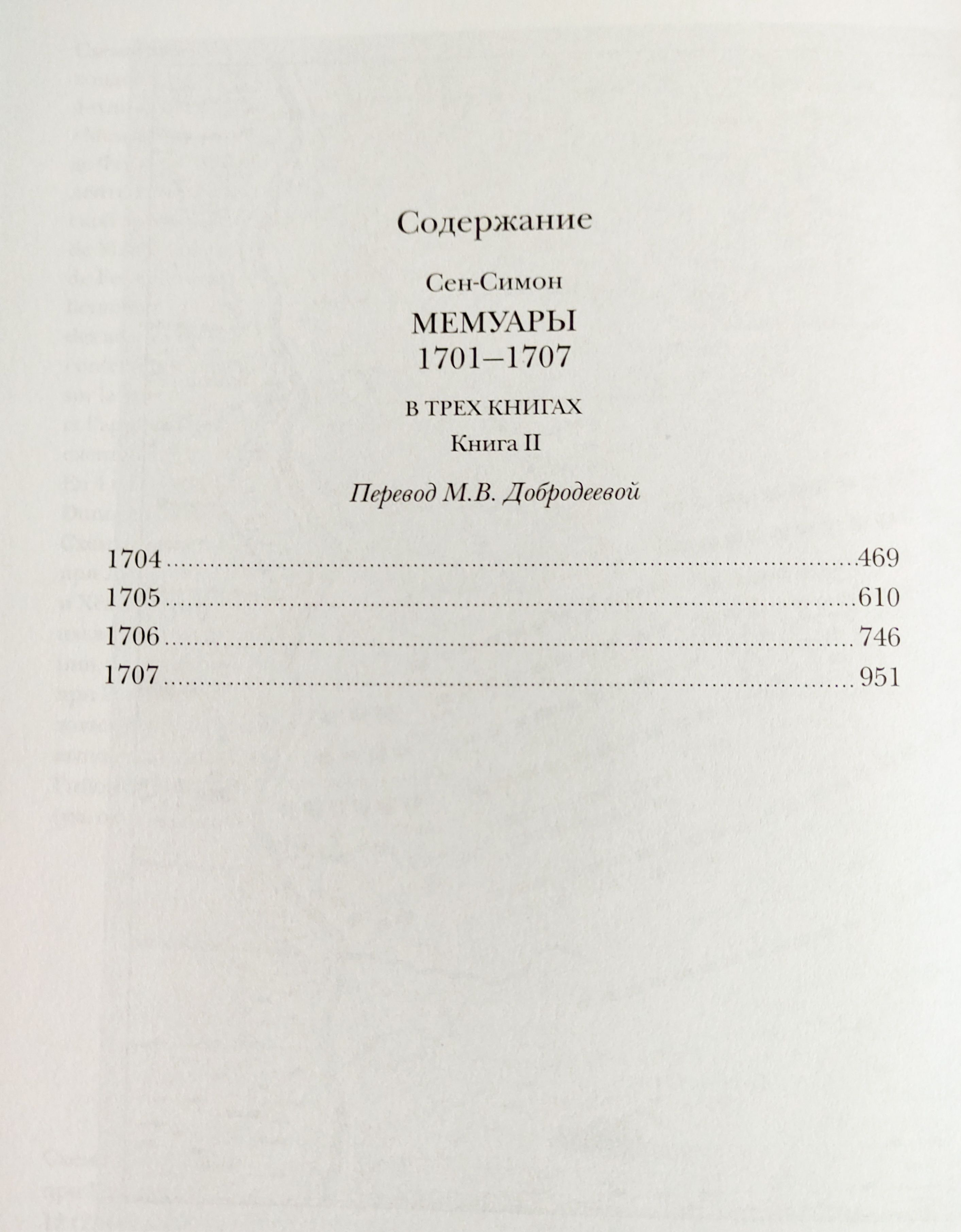 Второй том «Мемуаров» герцога де Сен-Симона (1675 — 1755; Луи де Рувруа, герцог де Сен-Симон; французское Louis de Rouvroy, duc de Saint-Simon) отмечен событиями, произошедшими с 1701-го (последнего, по выражению мемуариста, счастливого года в жизни Людовика XIV) по 1707 год. В 1701 году началась Война за испанское наследство (1701—1714 годы), и Луи де Рувруа де Сен-Симон подробно описывает и анализирует большие и малые баталии на разных театрах войны в Германии, Фландрии, Испании и Северной Италии: сухопутные сражения при Карпи и Кьяри (1701 год), при Луццаре и Фридлингене (1702 год), при Хёхштедте (Бленхейме) (1703 год и 1704 год) и Шпейере (1703 год), при Рамийи (1706 год) и Альмансе (1707 год), вылазку имперцев в Кремоне (1702 год), битвы за Барселону (1705 год) и Турин (1706 год), бесчисленные осады городов, морские схватки в бухте Виго (1702 год) и у Гибралтара (1704 год) и многое другое. Автор рисует колоритные портреты французских военачальников высокого и низкого ранга; рассуждает о патриотизме; наглядно показывает, как личные качества полководцев и чиновников, ответственных за снабжение войск, влияли на исход сражений и целых военных кампаний, во время которых храбрость соседствовала с трусостью, а верность долгу — с предательством. Литературное дарование мемуариста разворачивается во всю мощь, когда он рассказывает о преследовавших Францию горестных поражениях и о редких в те годы победах. Наряду с персонажами, уже участвовавшими в событиях, охваченных первым томом “Мемуаров” Луи де Рувруа де Сен-Симона (1691—1701 годы), впервые появляются в повествовании или начинают действовать гораздо активнее и многие другие личности, выдвинувшиеся на авансцену истории в переломные моменты: полководцы Евгений Савойский и его кузен Людвиг Баденский, герцог Мальборо и целая плеяда маршалов Франции, эрцгерцог Карл, принцесса Орсини, Ференц Ракоци, шведский король Карл XII, Антоний Гейнзиус, английская королева Анна, герцог Савойский и курфюрст Баварский… Обращение к перипетиям «большой» и «малой» истории диктует многоплановость повествования, поэтому масштабные исторические события перемежаются в «Мемуарах» с частными эпизодами из жизни двора и отдельных семейств, сообщениями о политических дрязгах и интригах, историческими анекдотами. Сен-Симон подробно разбирает вопросы церемониала (на сей раз — испанского), взаимоотношения Церкви и государства, судебные процессы, в том числе проходившие с его личным участием. Издание содержит две научные статьи (о литературной стороне «Мемуаров» Сен-Симона и о Войне за испанское наследство, рассмотренной с «испанской» точки зрения), развёрнутые примечания, аннотированный указатель имён, генеалогические таблицы, географические карты, иллюстрации и другие вспомогательные материалы.