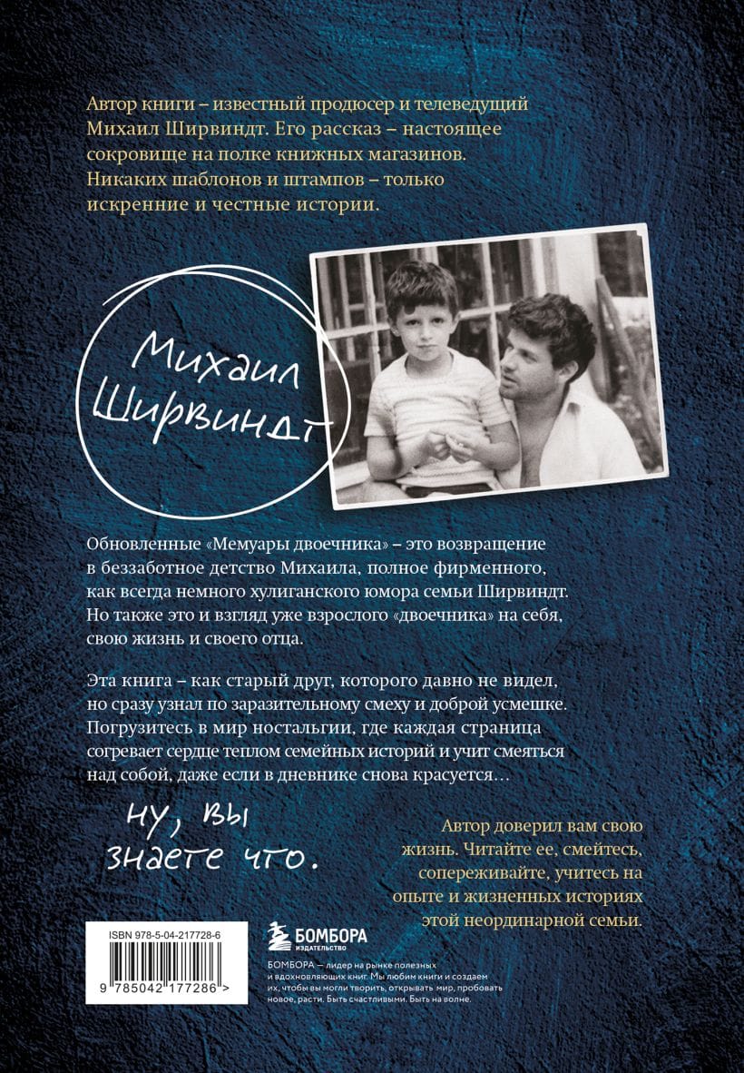 Автор книги – известный продюсер и телеведущий Михаил Ширвиндт, сын всеми любимого актера Александра Ширвиндта. Его рассказ - настоящее сокровище на полке книжных магазинов. Никаких шаблонов и штампов - только искренние и честные истории. Александр Ширвиндт. При упоминании этого имени у каждого читателя рождается ассоциация с глубоким и умным юмором. Яблоко упало недалеко от яблони, и книга Ширвиндта Михаила пропитана все тем же юмором, иронией, – и, что особенно ценно, самоиронией. Видимо, это в семье родовое.С первых страниц книги автор приводит вас в свой дом, свою жизнь. Он рассказывает о ней без прикрас, не позируя и не стараясь выглядеть лучше, чем он есть. В книге, кроме семьи Ширвиндтов, вы встретитесь со многими замечательными людьми, среди которых Гердты, Миронов, Державин, Райкин, Урсуляк и другие. Автор доверил вам свою жизнь. Читайте ее, смейтесь, сопереживайте, учитесь на опыте и жизненных историях этой неординарной семьи.