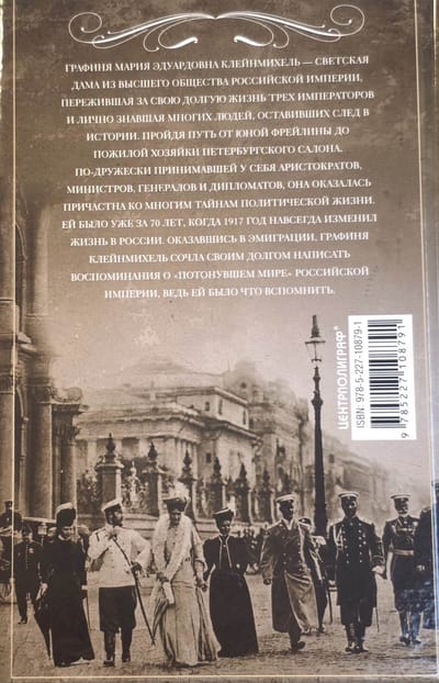 Графиня Мария Эдуардовна Клейнмихель — светская дама из высшего общества Российской империи, пережившая за свою долгую жизнь трех императоров и лично знавшая многих людей, оставивших след в истории. Пройдя путь от юной фрейлины до пожилой хозяйки петербургского салона, по-дружески принимавшей у себя аристократов, министров, генералов и дипломатов, она оказалась причастна ко многим тайнам политической жизни. Ей было уже за 70 лет, когда 1917 год навсегда изменил жизнь в России. Оказавшись в эмиграции, графиня Клейнмихель сочла своим долгом написать воспоминания о «потонувшем мире» Российской империи, ведь ей было что вспомнить.
