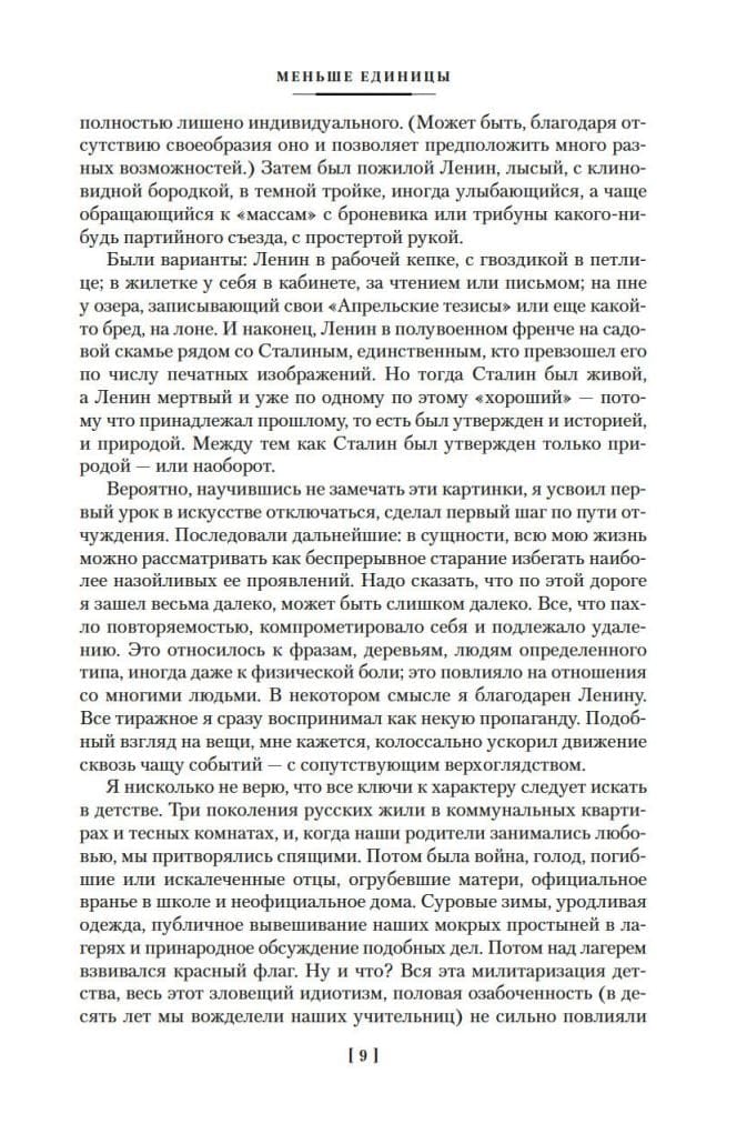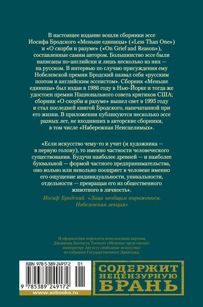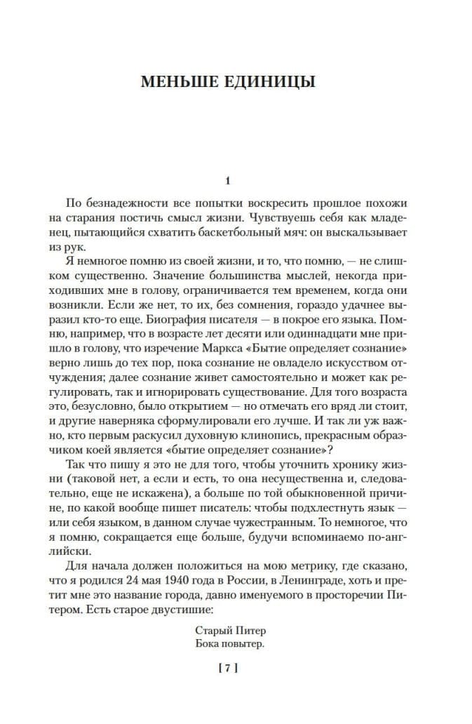 В настоящее издание вошли сборники эссе Иосифа Бродского «Меньше единицы» («Less Than One») и «О скорби и разуме» («On Grief and Reason»), составленные самим автором. Большинство эссе были написаны по-английски и лишь несколько из них — на русском. В интервью по случаю присуждения ему Нобелевской премии Бродский назвал себя «русским поэтом и английским эссеистом». Сборник «Меньше единицы» был издан в 1986 году в Нью-Йорке и тогда же удостоен премии Национального совета критиков США; сборник «О скорби и разуме» вышел свет в 1995 году и стал последней книгой Бродского, напечатанной при его жизни. В приложении публикуются несколько эссе разных лет, не входивших в авторские сборники, в том числе «Набережная Неисцелимых».