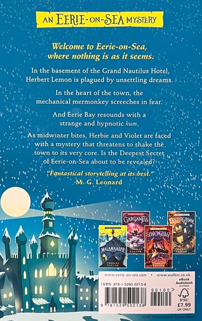 It is midwinter once again, and the hosts of a paranormal podcast have descended on Eerie-on-Sea eager for a sighting of the legendary malamander. Herbert Lemon, Lost-and-Founder at the Grand Nautilus Hotel, is feeling uneasy – and not just because of the visitors. He’s being plagued by unsettling dreams, and the head-splitting “Eerie Hum” that is reverberating through the town. Something is dreadfully wrong, and it seems to be coming from Eerie's very core. Herbie and his friend Violet Parma will need all their courage as they head deep below the town to seek answers. Perhaps here, finally, they – and the malamander too – will discover the Deepest Secret of Eerie-on-Sea.