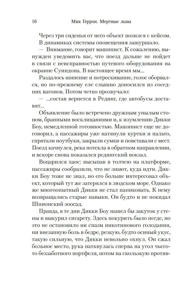 Мика Геррона называли «Джоном Ле Карре нашего времени» и новой надеждой британской литературы, сравнивали с Рэймондом Чандлером и Кингсли Эмисом, Ивлином Во и Грэмом Грином, Элмором Леонардом и Джозефом Хеллером. Герроновские романы — это «смешная, на грани фарса, изумительно циничная карикатура на политиков, функционеров, междоусобную грызню и Большую игру» (Booklist), а его герои («хромые кони», они же слабаки из Слау-башни) — это проштрафившиеся контрразведчики, наказанные «за пристрастие к наркотикам, алкоголю или распутству; за интриги и предательство; за недовольство и сомнения; а также за непростительную оплошность». Надзирает над ними Джексон Лэм — «Фальстаф наших дней» (Sunday Times) и «один из самых монструозных персонажей в современной литературе» (Бернард Корнуэлл). Во втором романе цикла, «Мертвые львы», старый знакомый Лэма времен службы в Берлине, бывший осведомитель по имени Дикки Боу, умирает в автобусе на подъезде к Оксфорду; и мало того, что смерть его выглядит подозрительно, но на его мобильном телефоне Лэм находит неотправленное сообщение с одним словом: «Цикады». А значит есть вероятность, что мифическая агентурная сеть глубокой конспирации — не такая уж мифическая. Но в МИ-5 не до того, контрразведка парализована «аудитом, который больше напоминает инквизицию», и разбираться с «Цикадами» и их мифическим (или все же не мифическим?) руководителем предстоит Лэму и его «хромым коням»… По первым книгам цикла «Слау-башня» запущен в производство телесериал (два сезона сразу), съемки велись в 2020–2021 гг. Роль Джексона Лэма исполнил Гэри Олдман, также в сериале снялись Джек Лауден, Оливия Кук, Джонатан Прайс, Кристин Скотт Томас, Кристофер Чунг. Постановщиком первого сезона выступил Джеймс Хоуз («Мерлин», «Черное зеркало», «Доктор Кто», «Алиенист», «Воспитанные волками»). Впервые на русском!