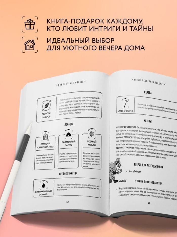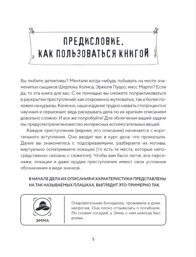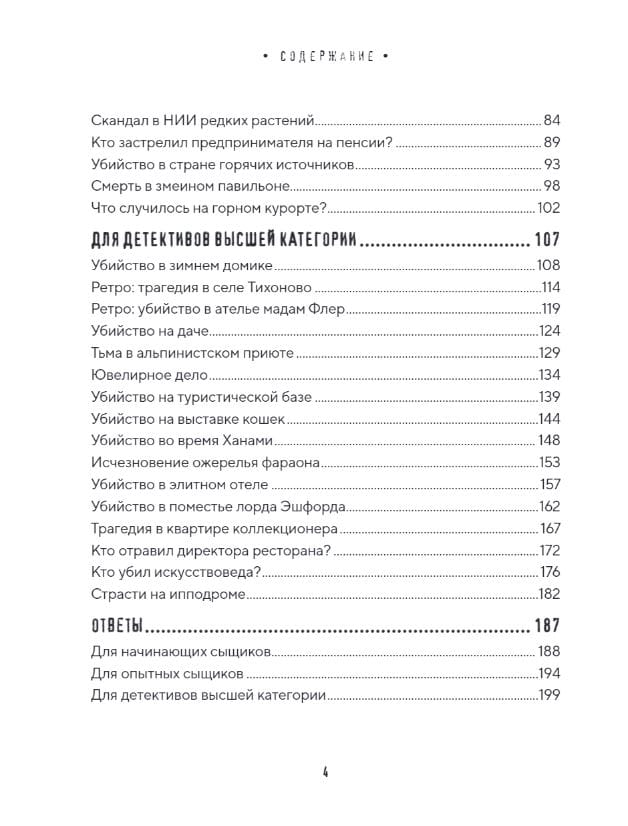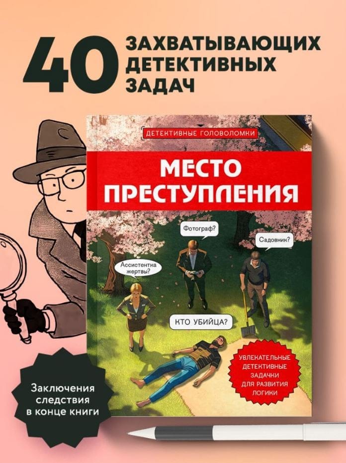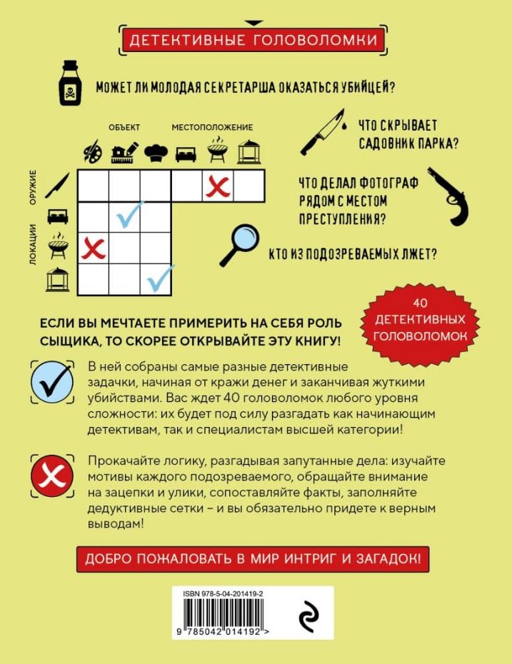 С этой книгой вы сможете примерить на себя роль настоящего сыщика! В ней собраны самые разные детективные задачки, начиная от кражи денег и заканчивая жутким убийством. Вас ждёт 40 головоломок любого уровня сложности: их будет под силу разгадать как начинающим детективам, так и специалистам высшей категории.