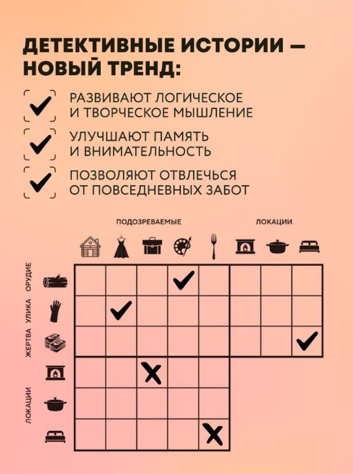 Прокачайте логику, разгадывая запутанные дела: изучайте мотивы каждого подозреваемого, обращайте внимание на зацепки и улики, сопоставляйте факты, заполняйте дедуктивные сетки — и вы обязательно придете к верным выводам!